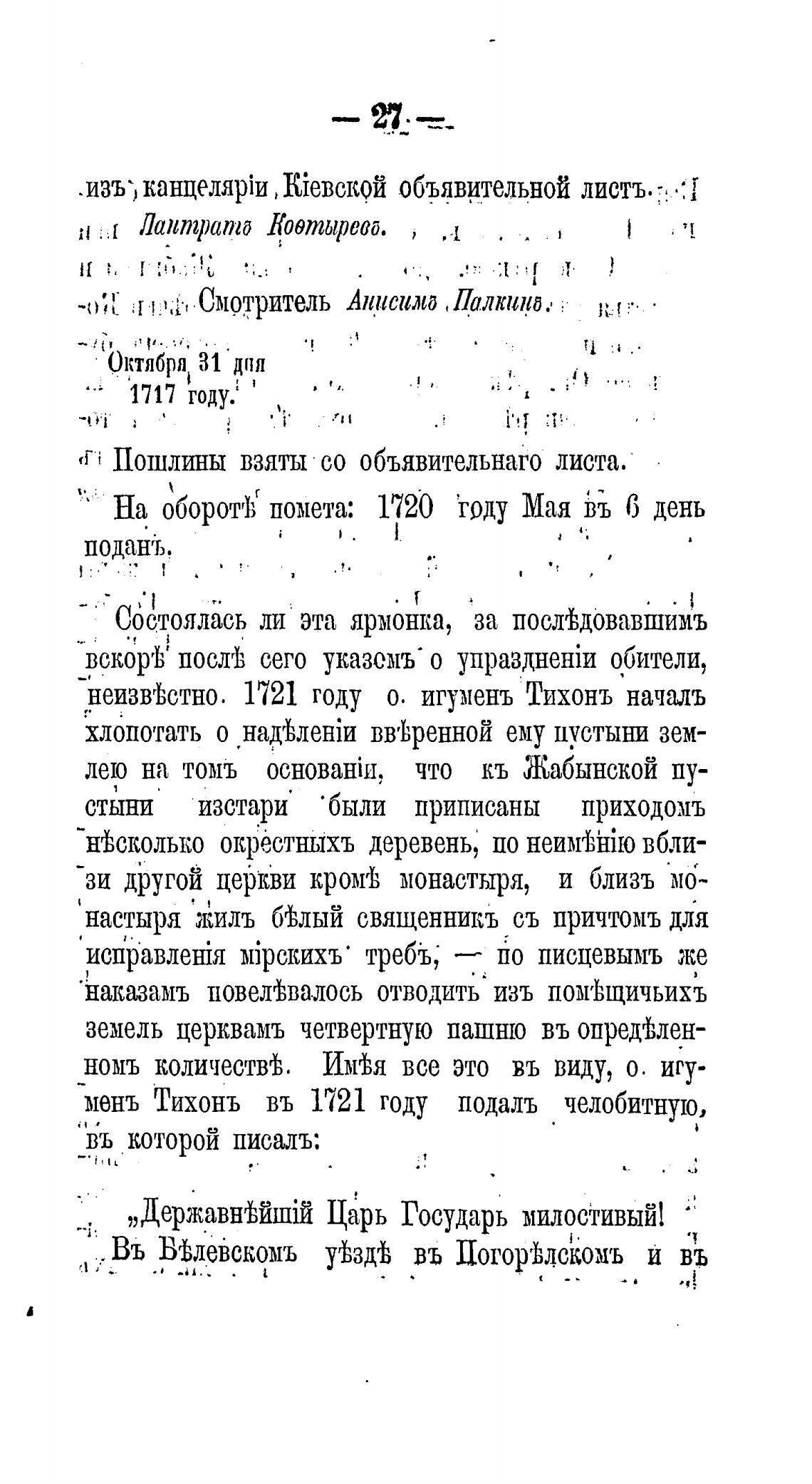 мень Тихонь въ 1721 году подаль челобитную,