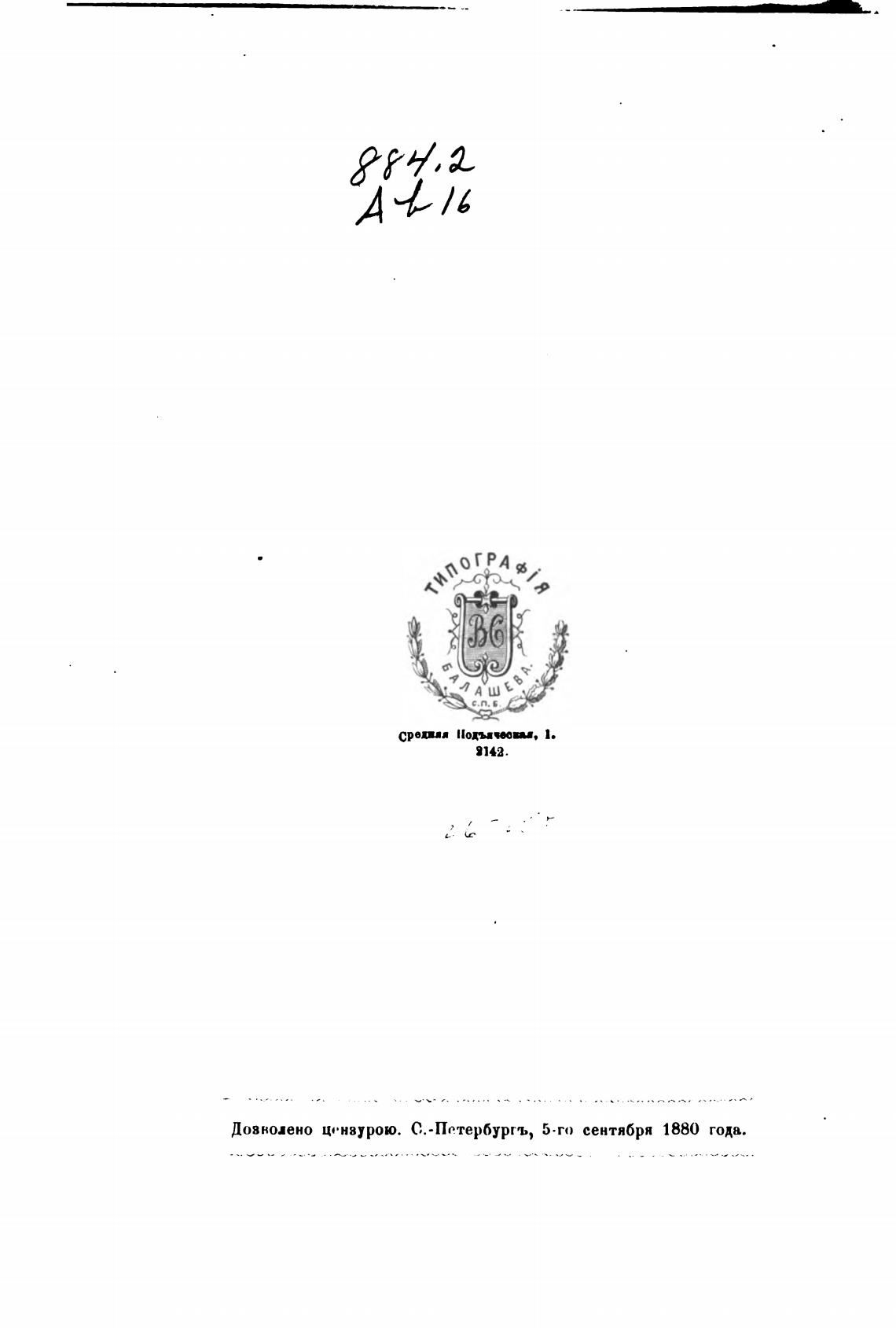 Дозволено цензурою. С.-Петербургъ, 5-го сентября 1880 года.