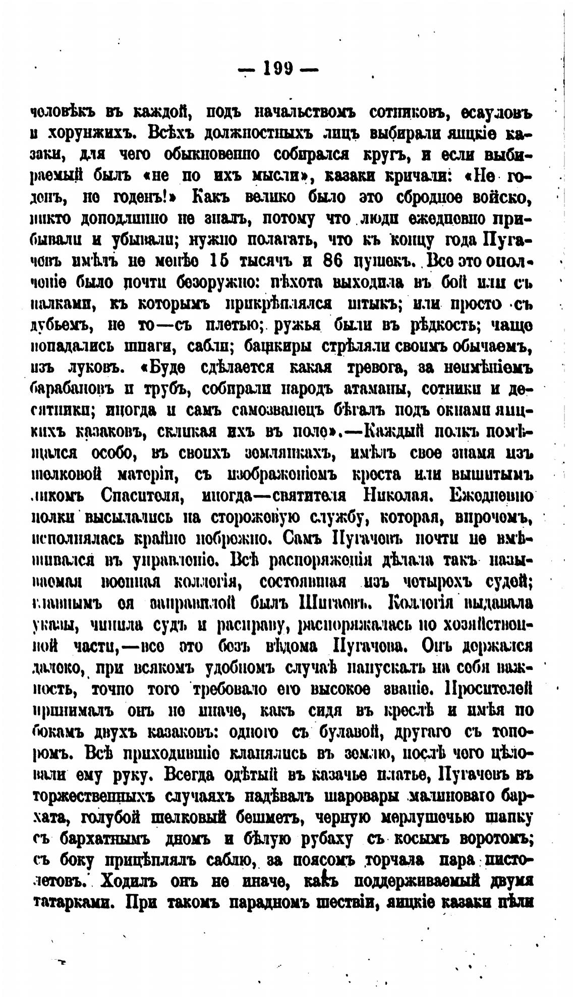 вами ему руку. Всегда од•ЬтыП въ казачье платье, Пугачовъ въ