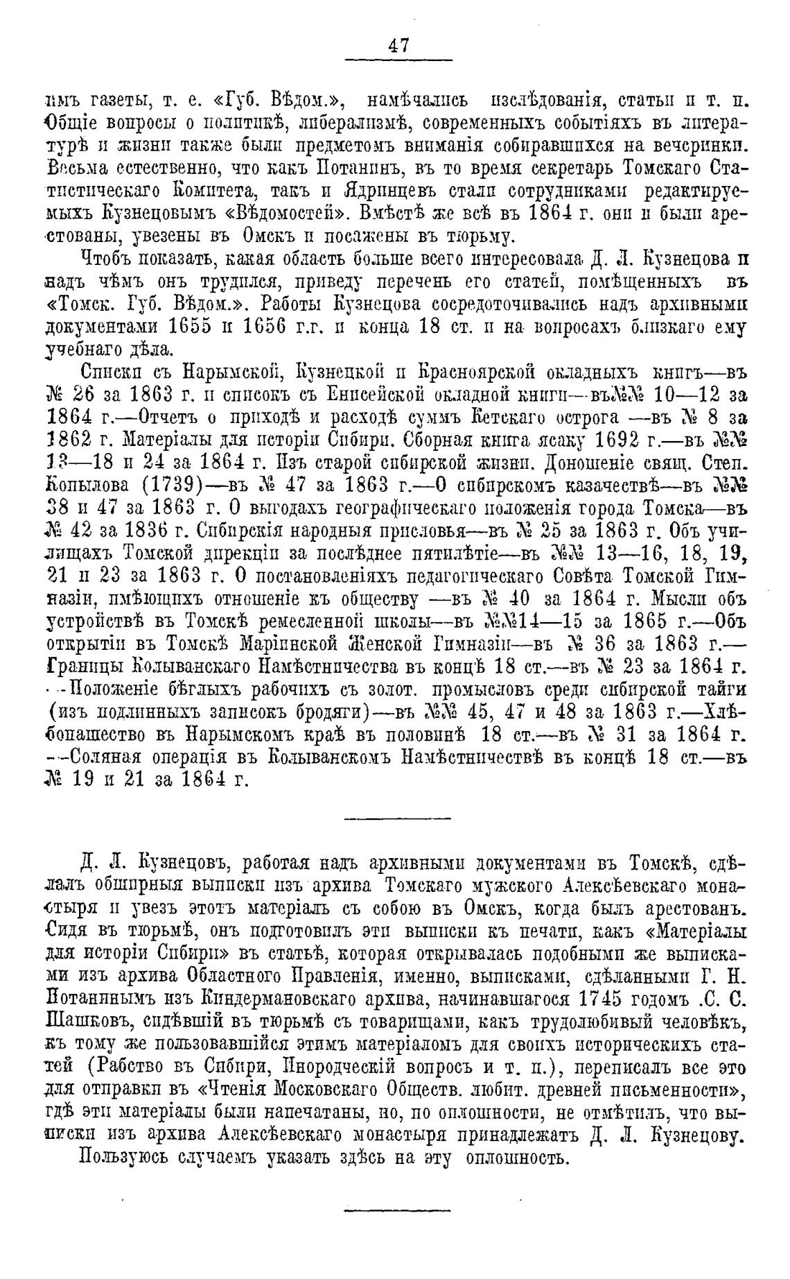 «Томск. Губ. Вћдом.». Работы Кузнецова сосредоточиваиись надъ архивными