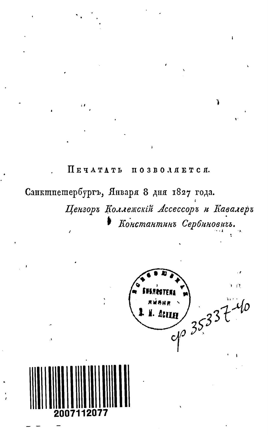 Санкшпешербургъ, Января 8 дня 1827 года.