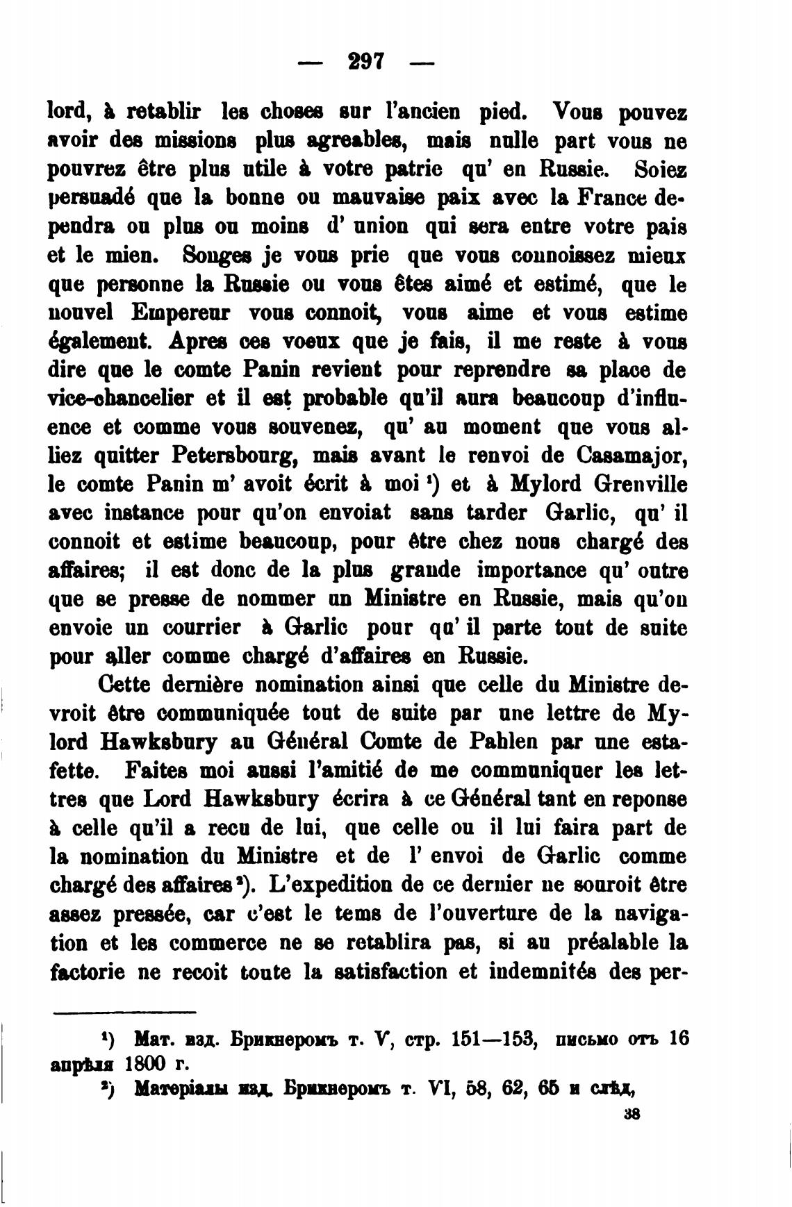 le comte Panin т' avoit 6crit moi 1) et Mylord Grenville