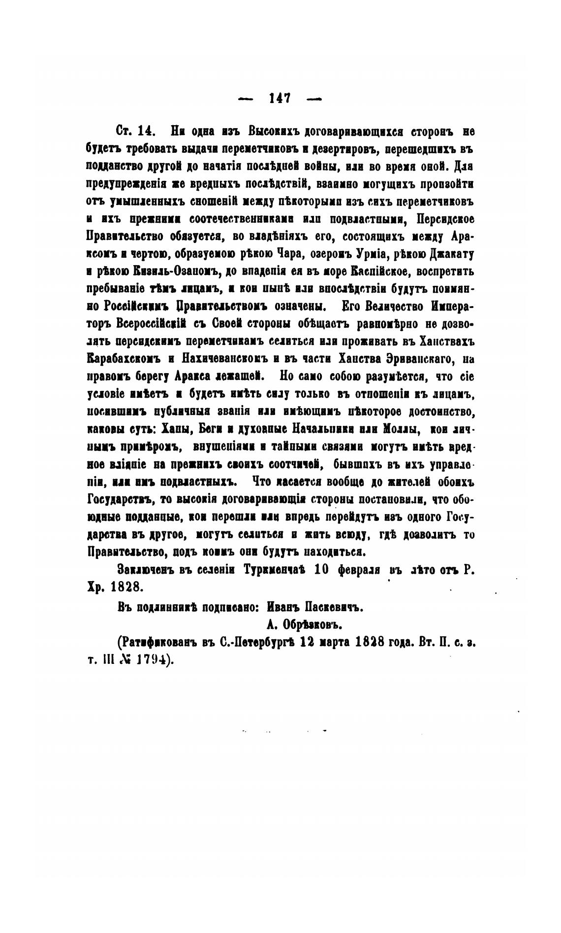 (Ратификованъ въ С..Петвр6ургв 12 парта 1828 года. Вт. П. е. з.