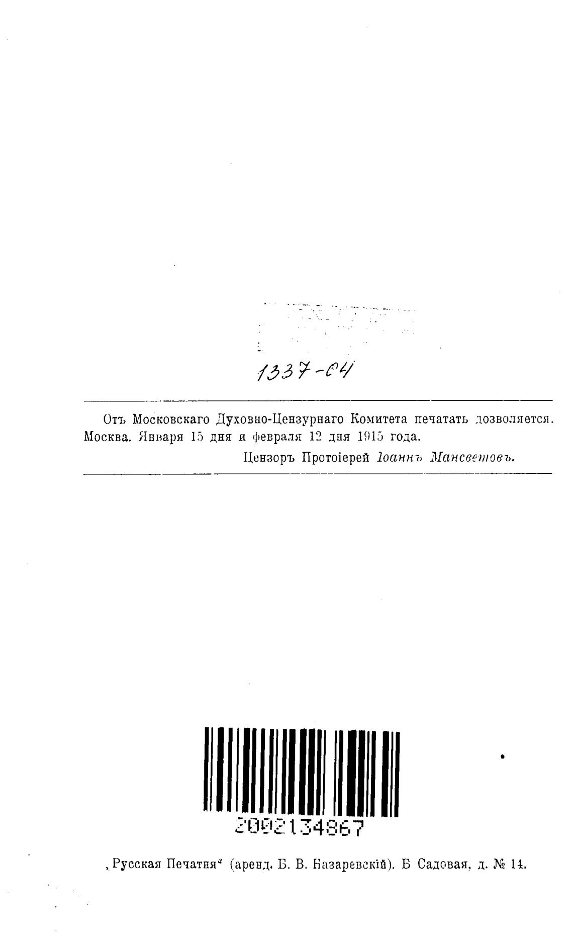 Отъ Московскаго Духовно-Цензурнаго Комитета печатать дозволяется.