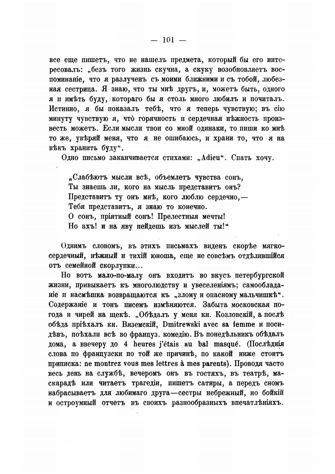 Одно письмо заканчивается стихами: „Adieu“. Слать хочу.