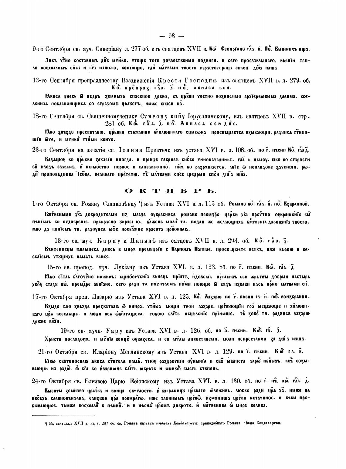 1-го Октября св. Роману Сладкоп•Ёвцу 1) изъ Устава ХУ 1 в. л. об. Ромзнн кб. б. Кдкрм.ной.