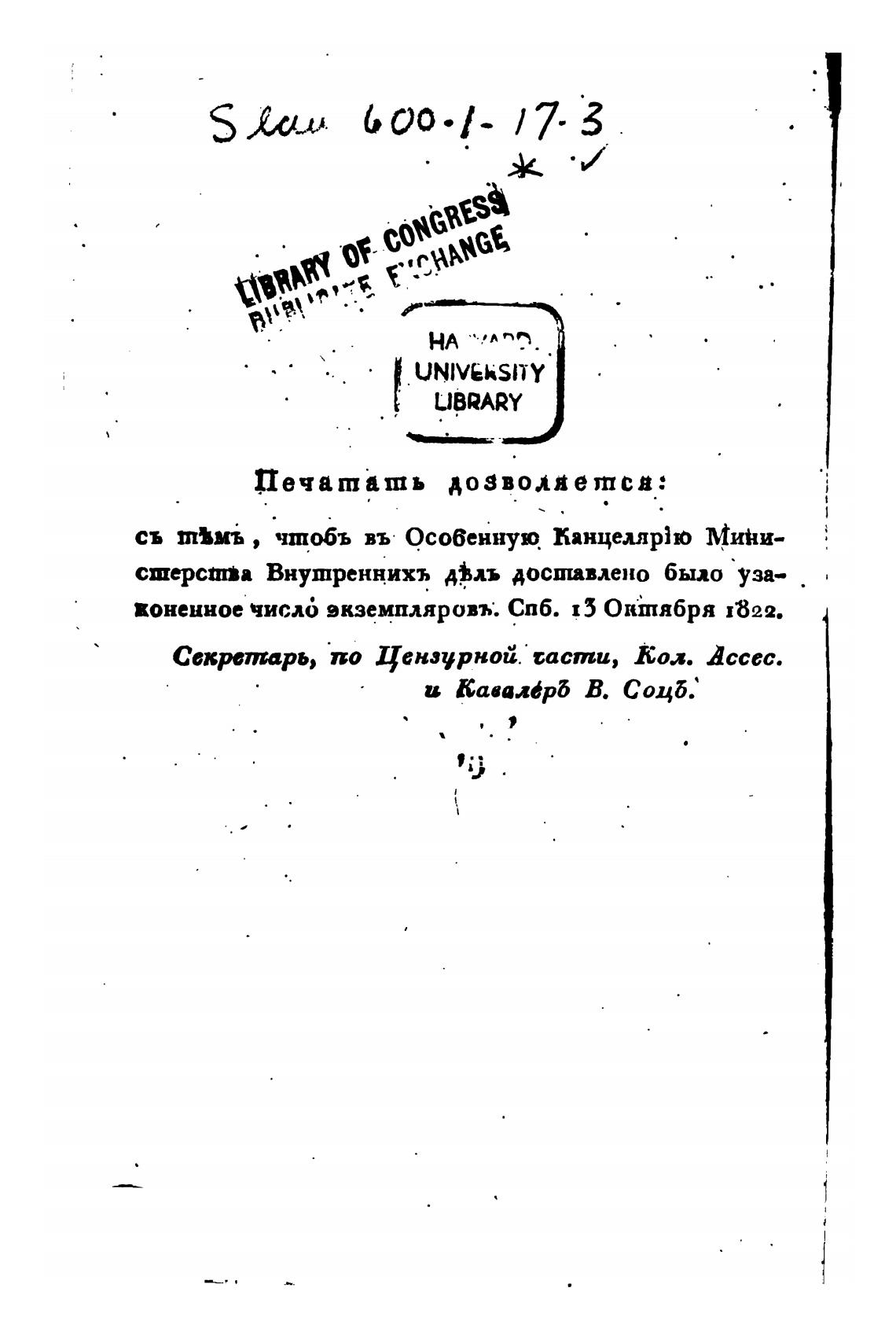 воненное числб вкземпляровћ. СПб. 15 Октября 1822.