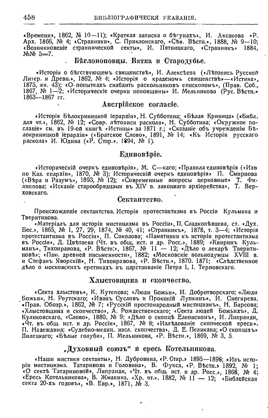 «Наши мистики сектанты», Н. Дубровина, «Р. Стар.) 1895—1896; «Изъ исто-