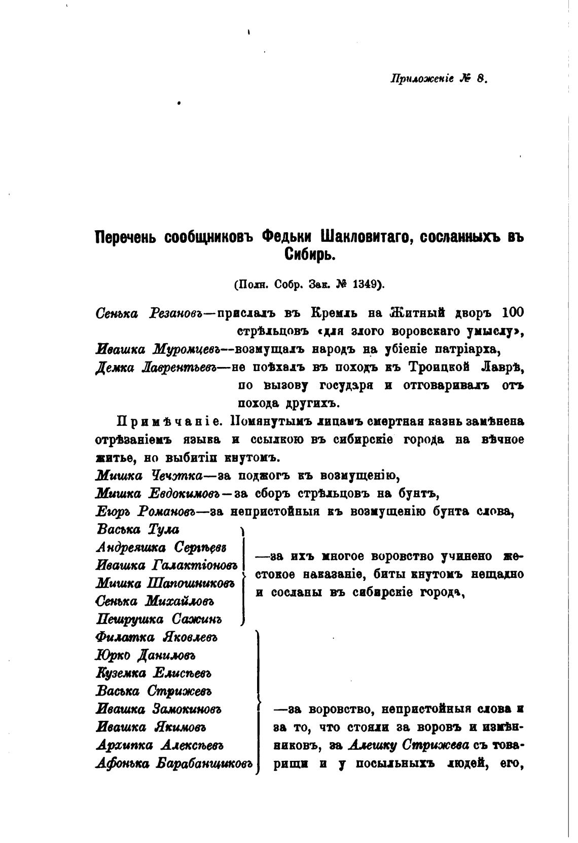 Перечень сообщниковъ Федьки Шакловитаго, сосланныхъ въ