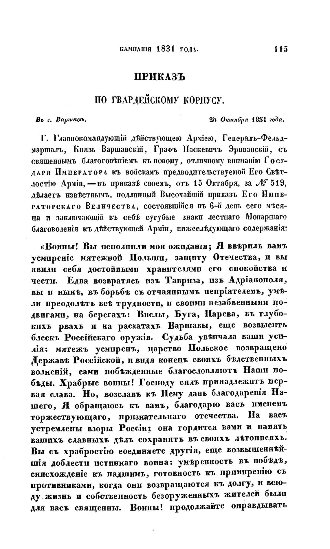 «Воины! Вы псполнпли мои ожиданця; Я вв%рплъ вамъ