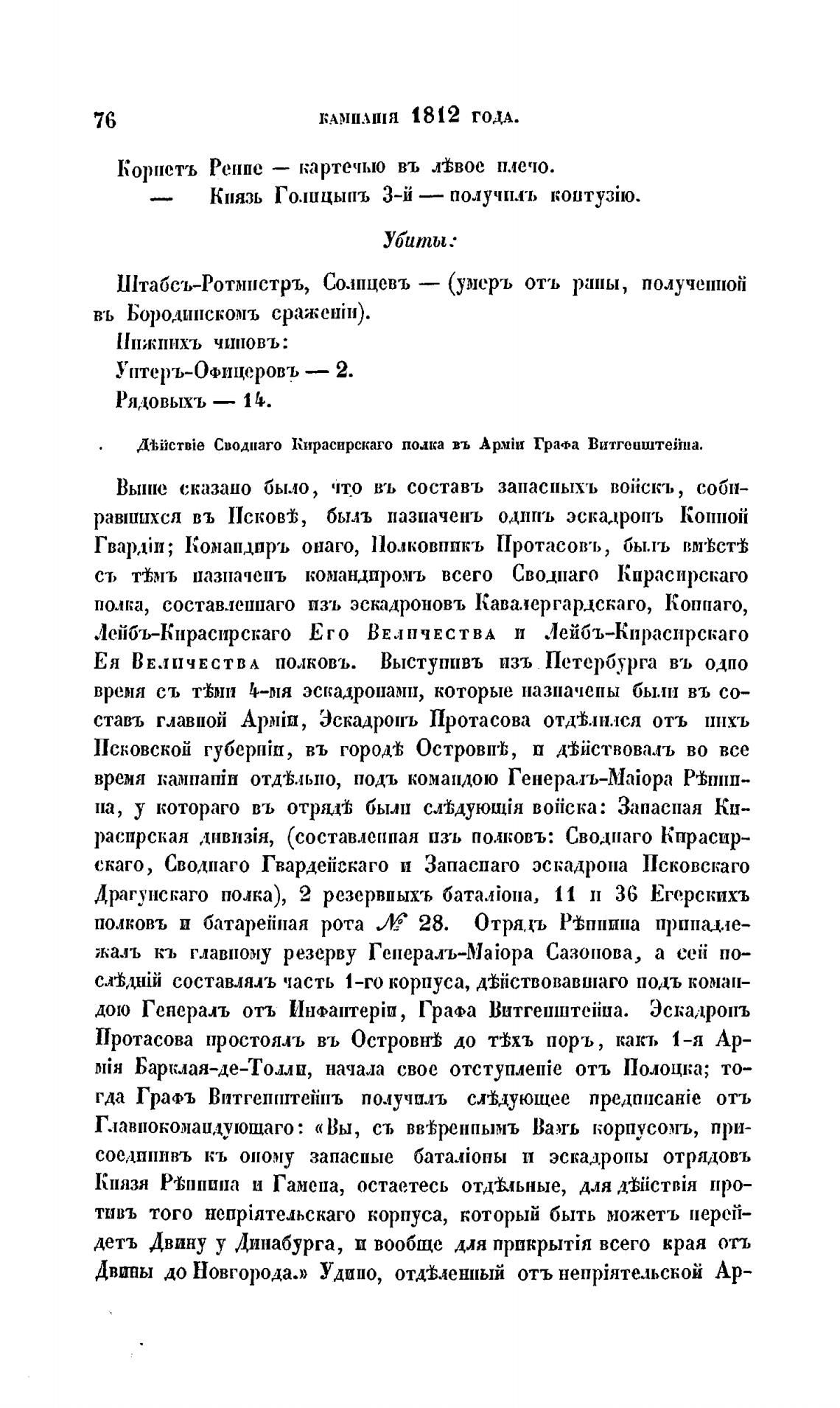 N;iicTBie Своднаго Кирасирскаго полка въ APMiII Графа Витгоиштейпа.