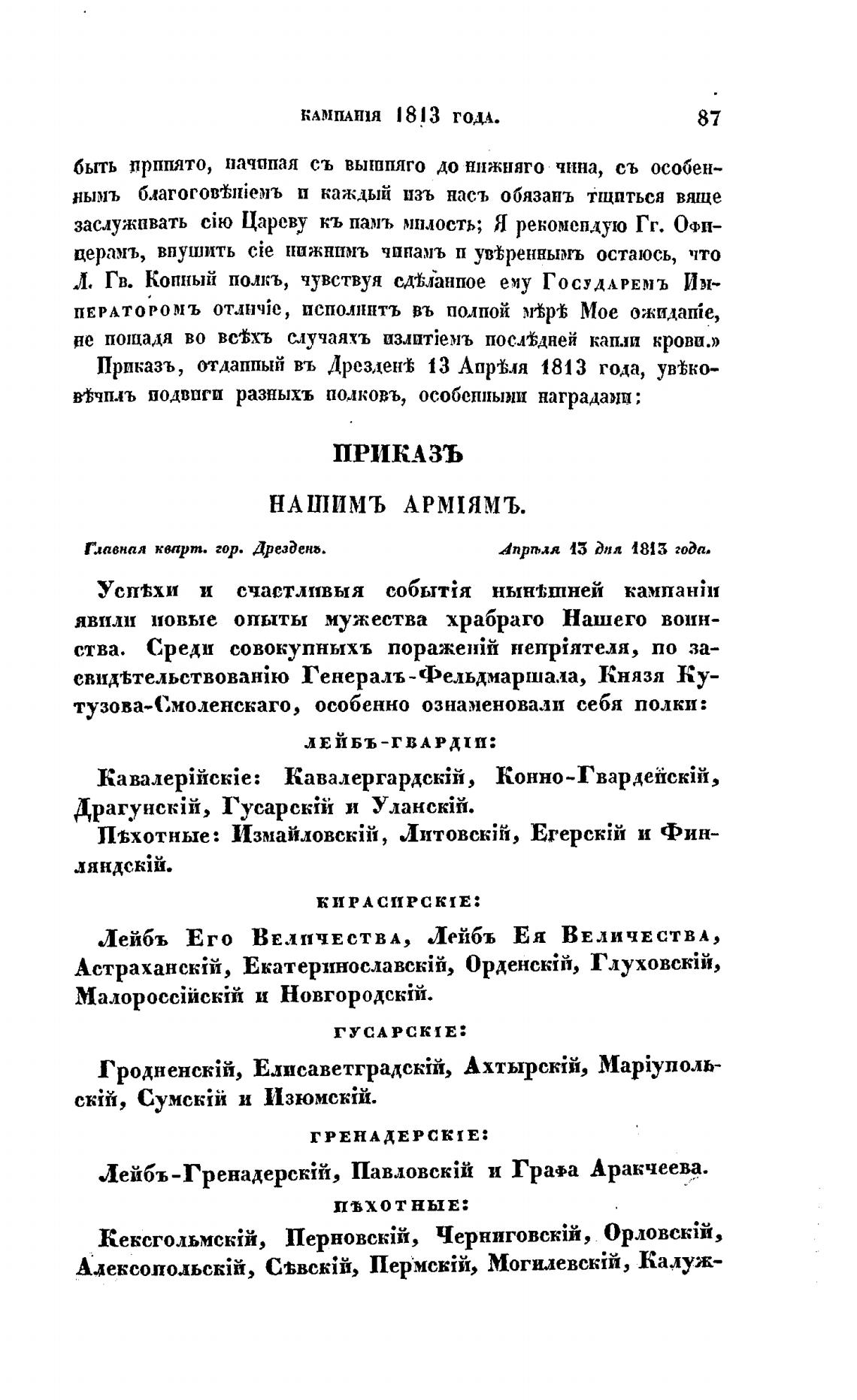 Приказъ, отдаппый въ Дрезден% 13 Апреьля 1813 года, ув%ко-