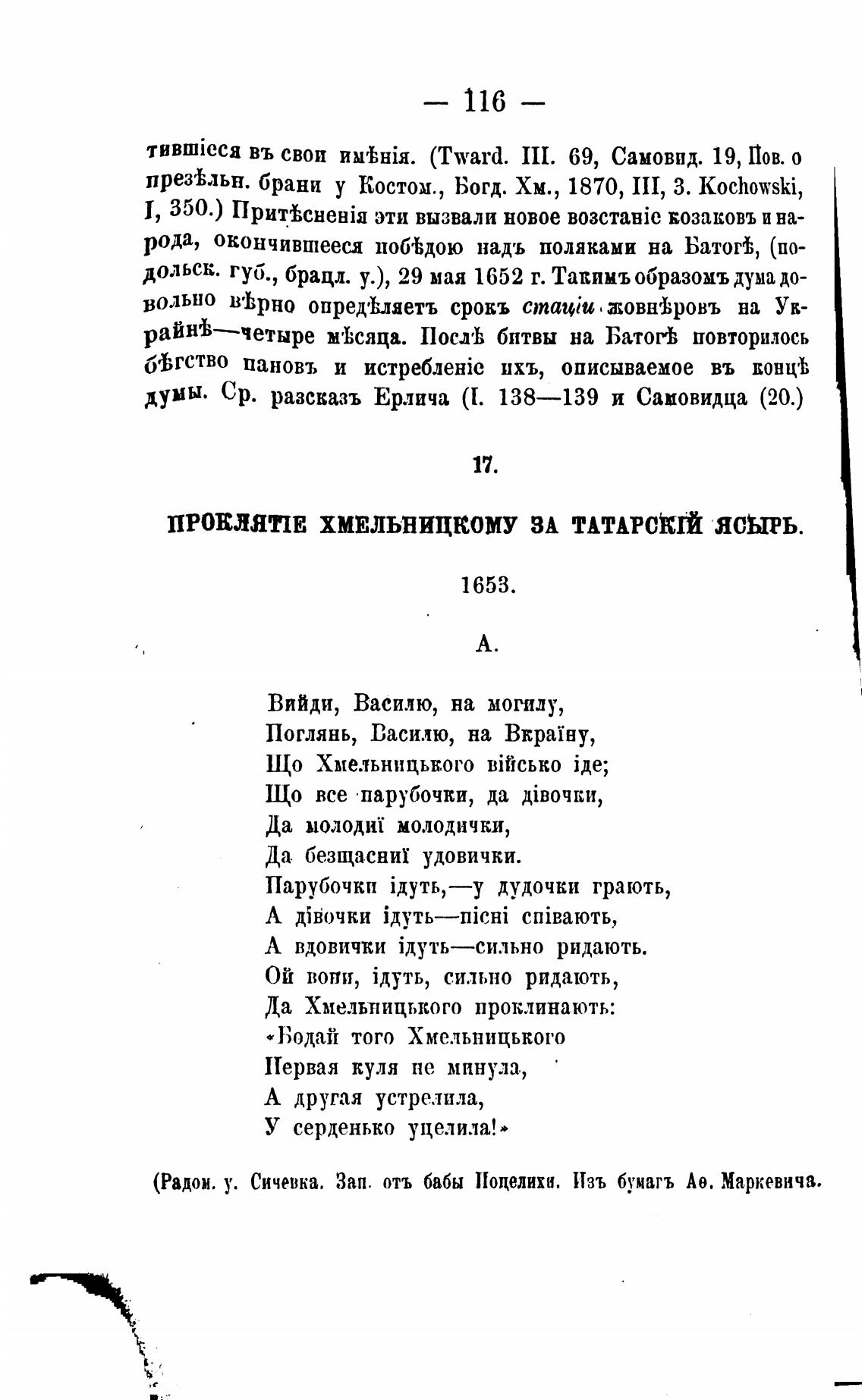 (Радом. у. Сичевка. Зап. отъ бабы Иоцелихн. Изъ бумагъ Ае. Маркевича.