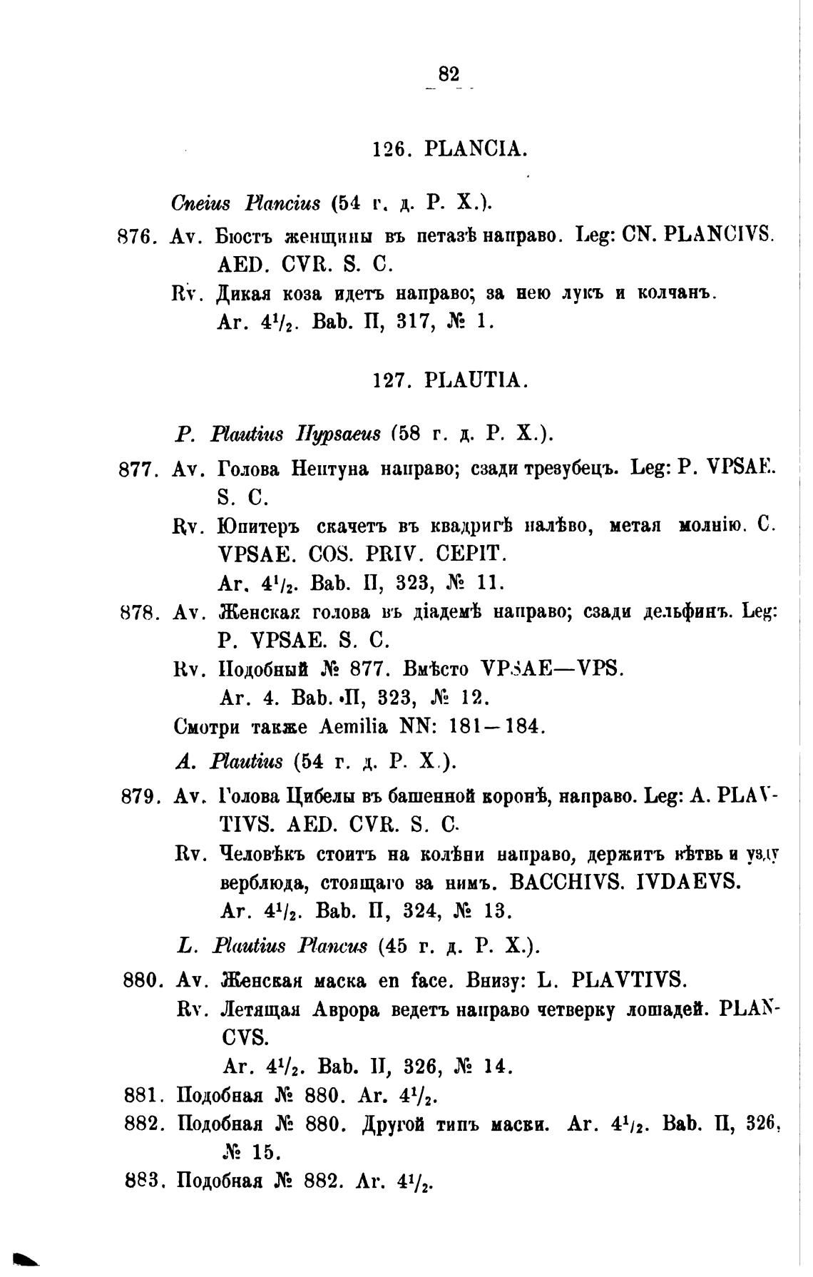 876. Av. Бюсть женщины въ пета“ направо. Leg: CN. PLANCIVS.