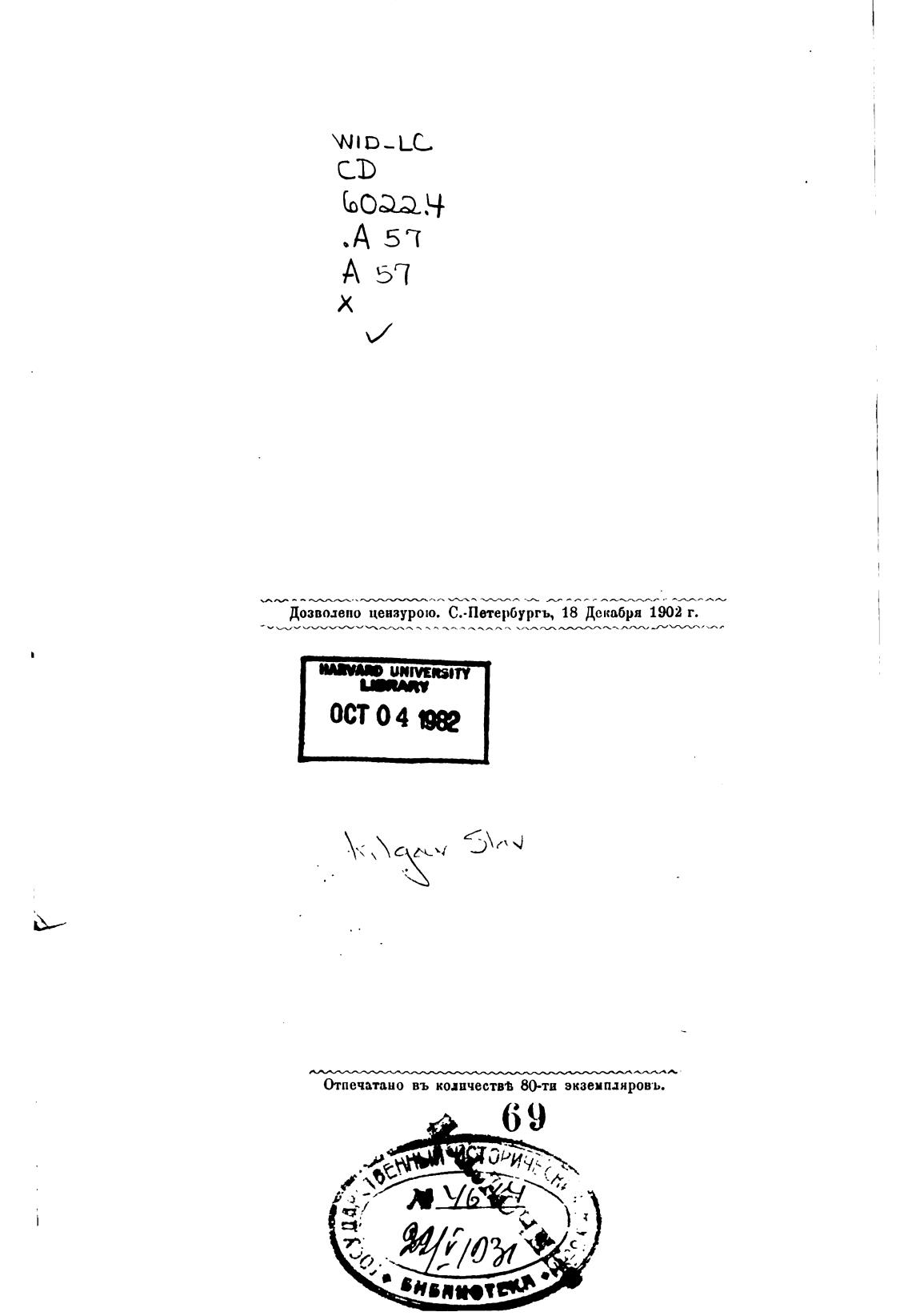 Отпечатано въ кодвчествћ 80-ти экземпдяровъ.