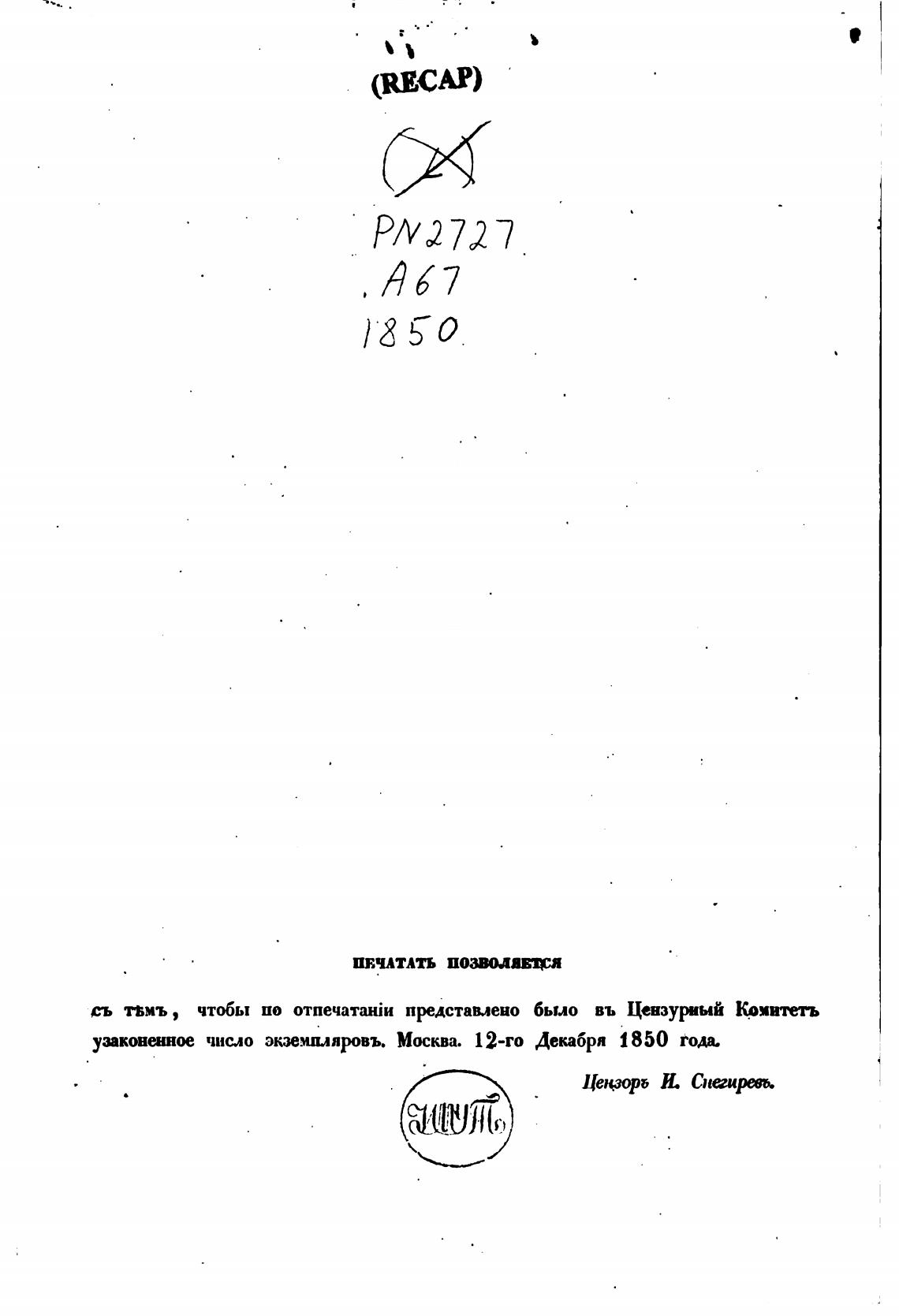 число экземпляровъ. Москва. 12-го Декабря 1850 Ёод