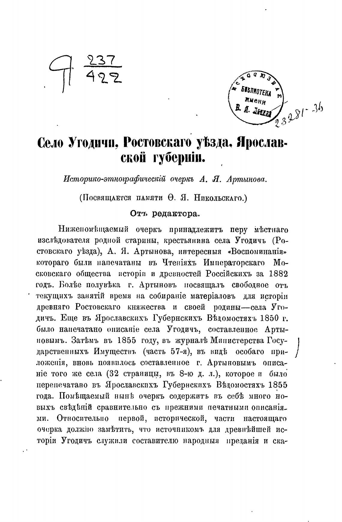 Село Угодичи, Ростовскаго ут,зда, Ярослав-