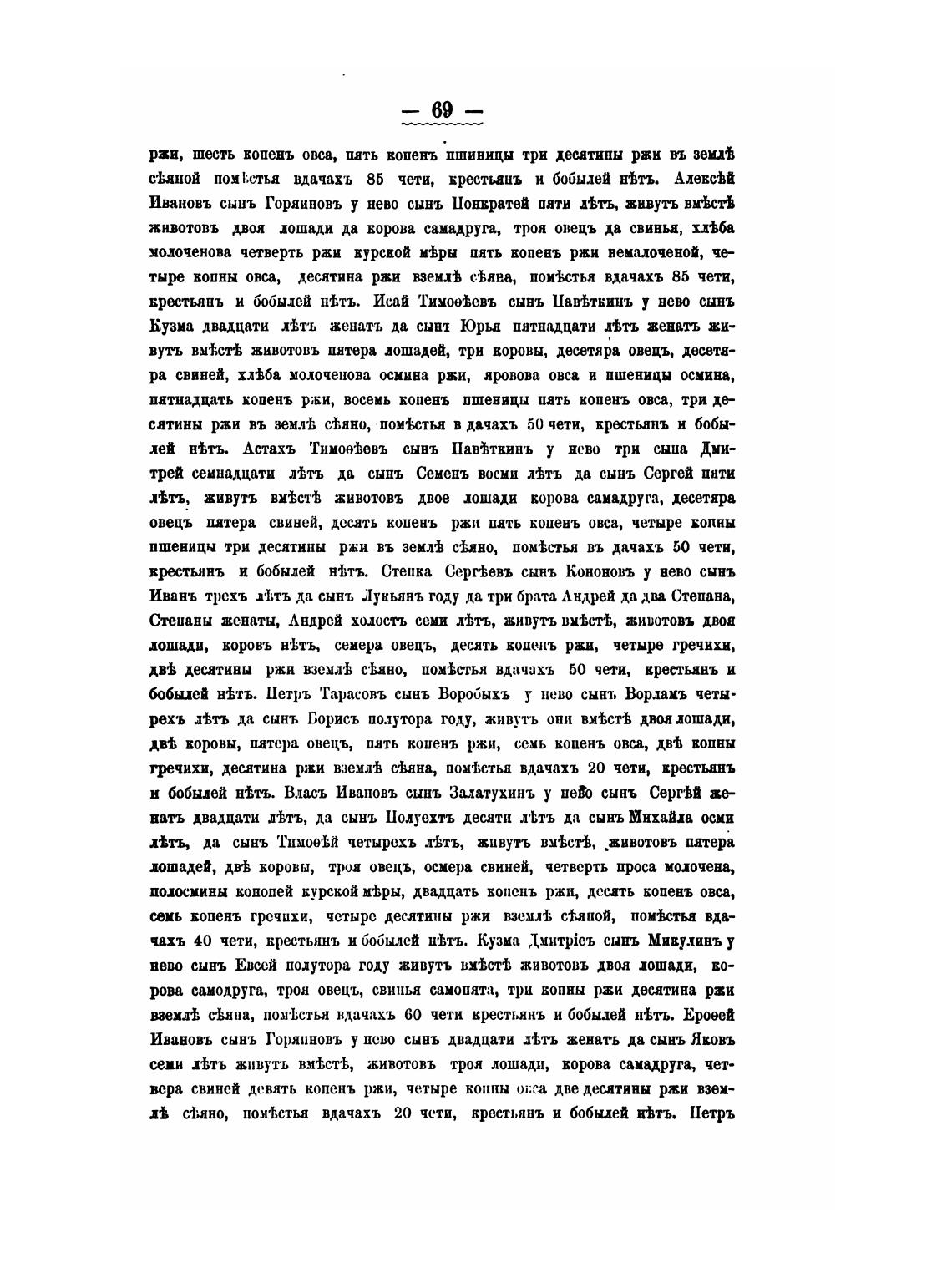 лошадей, дв•Ь коровы, троя овецъ, (Пера свиней, четверть проса молочена,