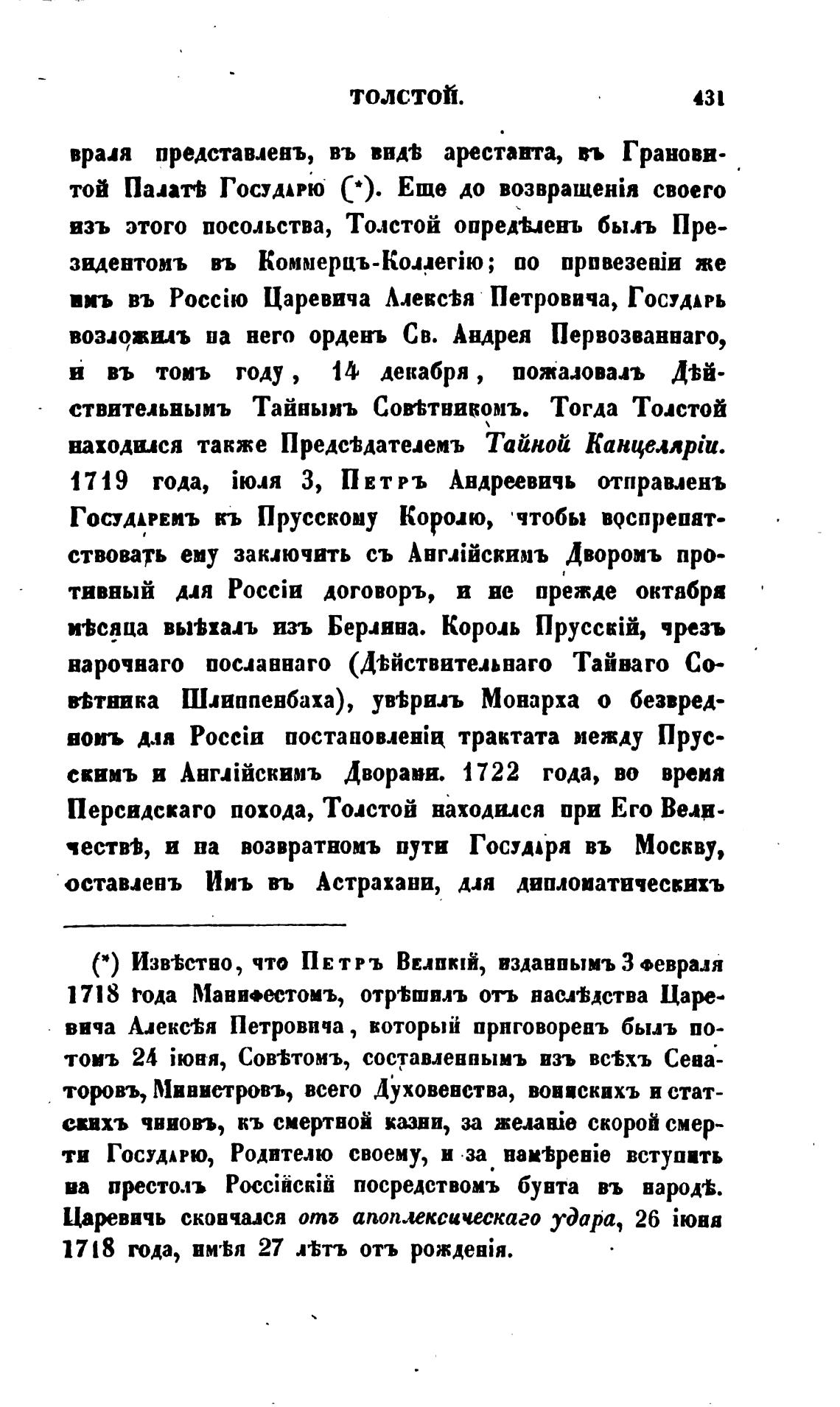 взъ этого посольства, Толстой опредшенъ быль Пре-