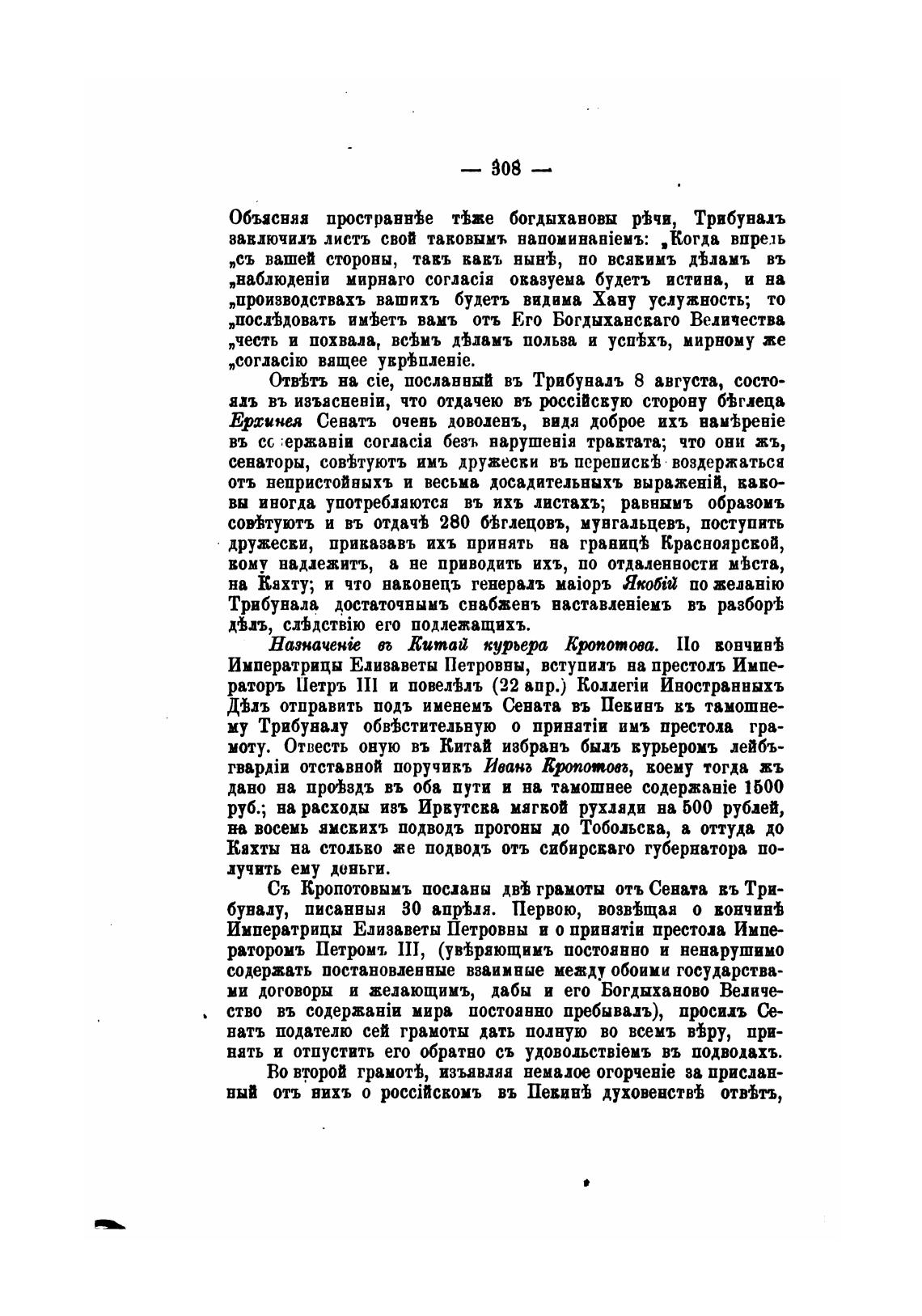 Съ Кропотовымъ поспны грамоты отъ Сената въ Три-