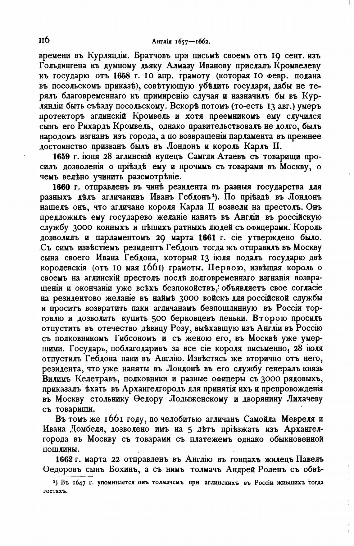1) Въ 1647 г. упоминается онъ толмачемъ при аглинскихъ въ жившихъ тогда