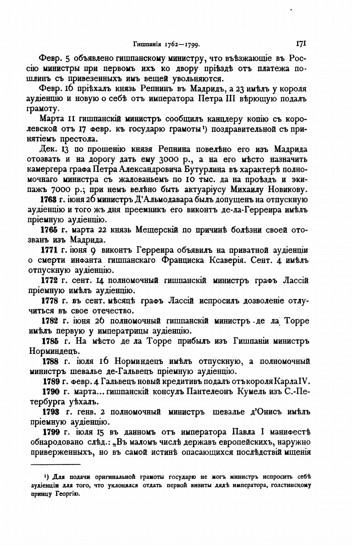 Февр. 16 прњхалъ князь Репнинъ въ Мадридъ, а 23 им%лъ у короля