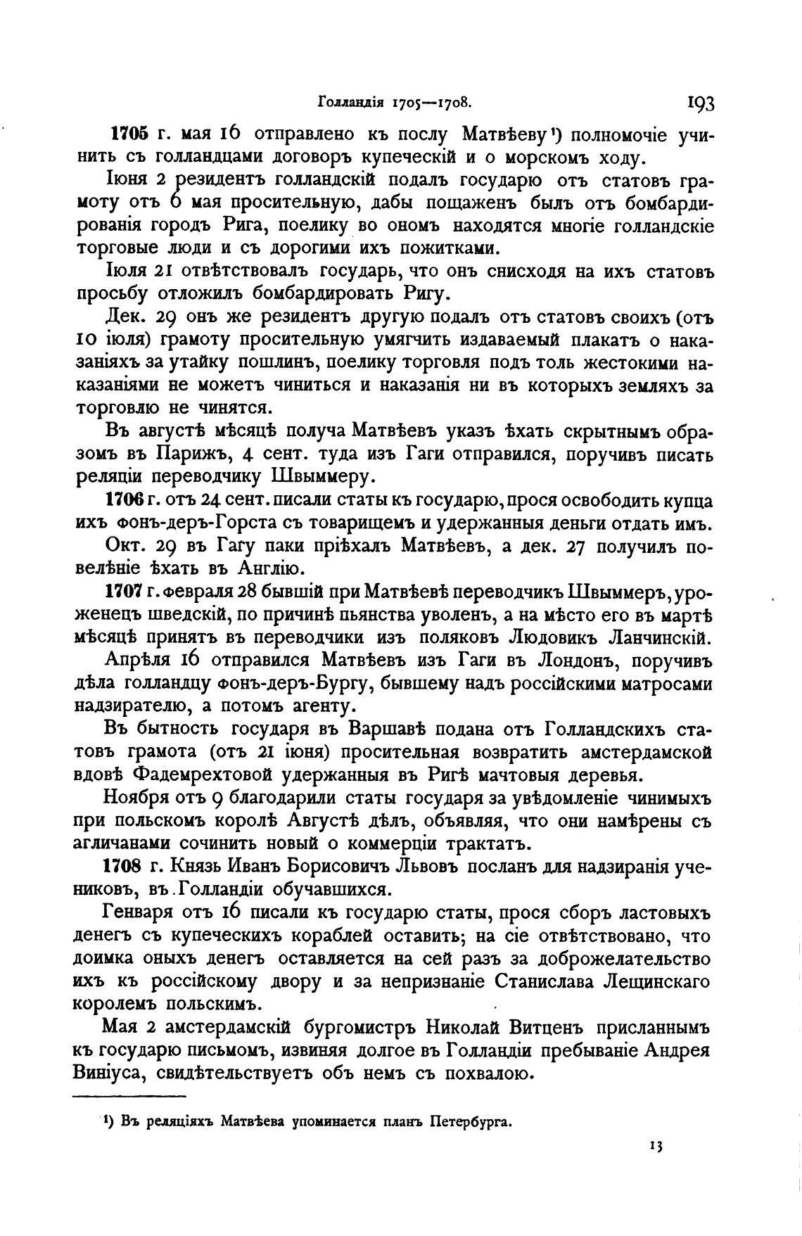 1) Въ Матв•Ьева упоминается планъ Петербурга.