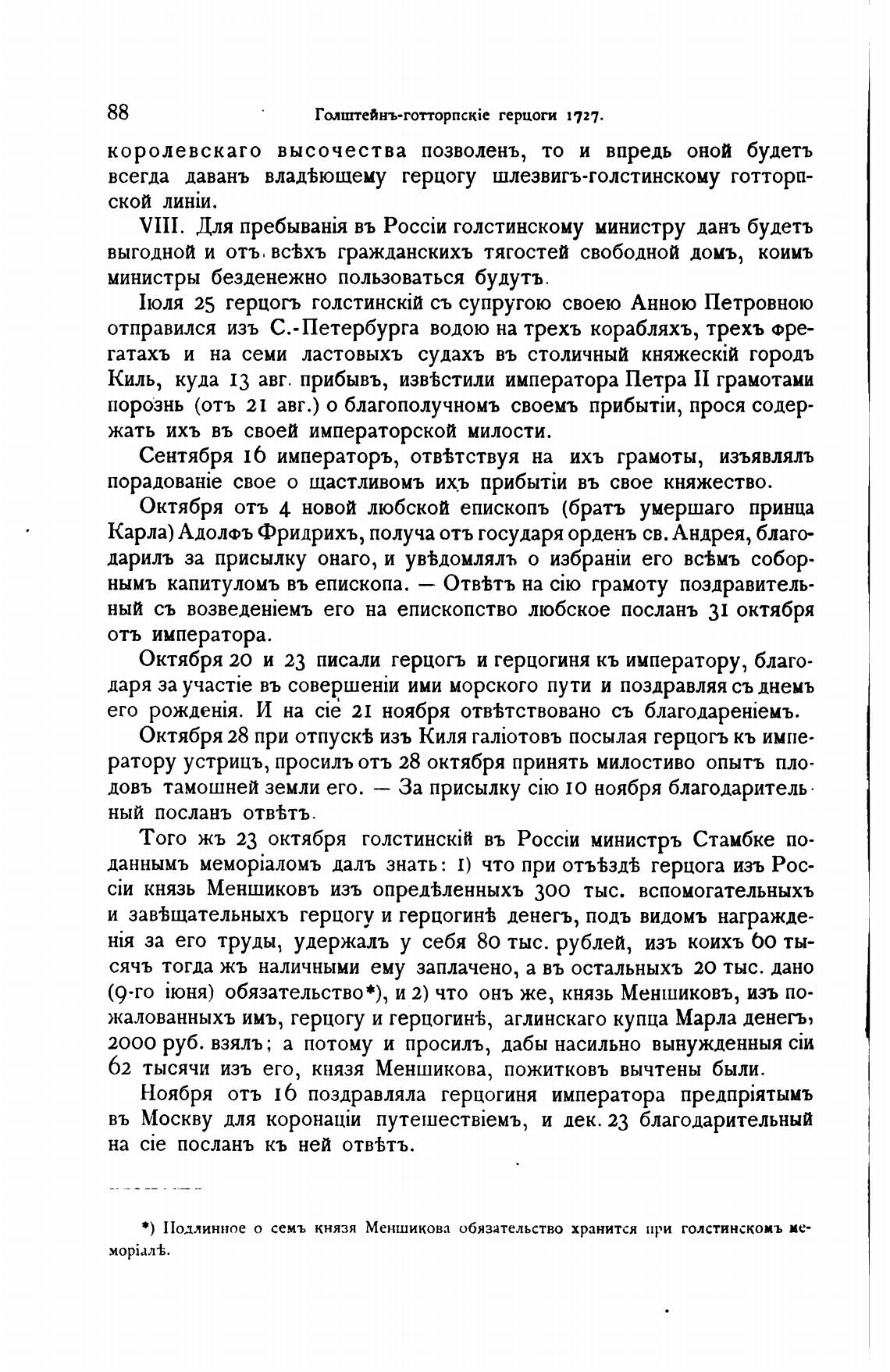 *) Подлинное о семь князя Меншикова обязательство хранится при голстинскомъ ие-