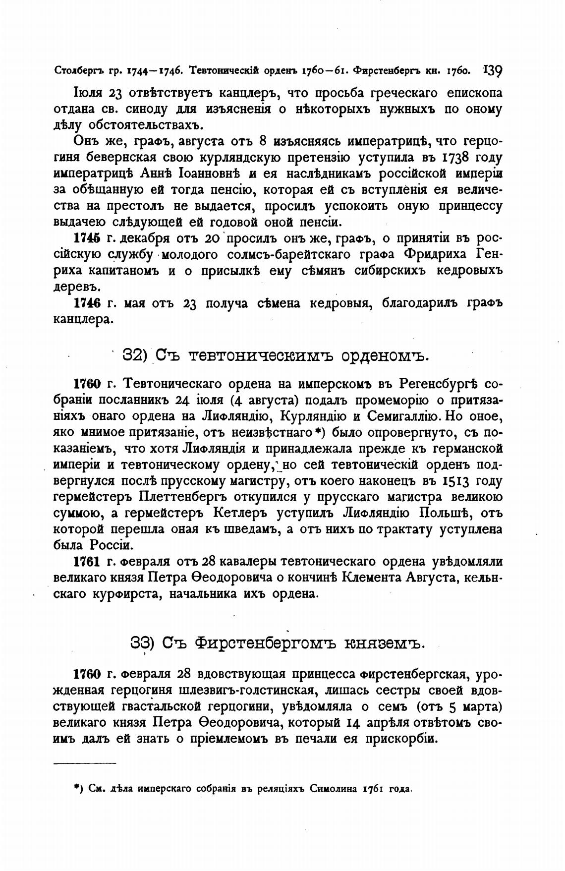 Столбергь гр. 1744—1746. орденъ 1760—61. Фирстенбергь кв. 1760. 139