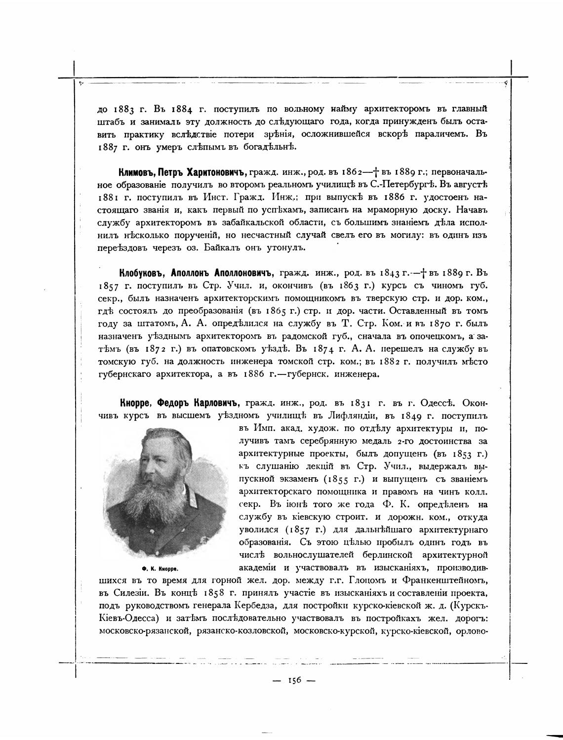 Кнорре, Федоръ Карловичъ, гражд. инж., род. въ 1831 г. въ г. Одесс%. Окон.