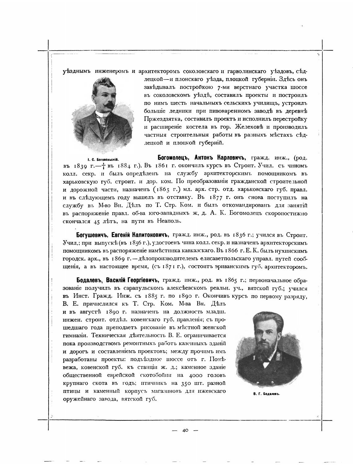 Богушевичъ, Евгенјй Капитоновичъ, гражд. инж., род. въ [836 г.; учился ю. Стрит.