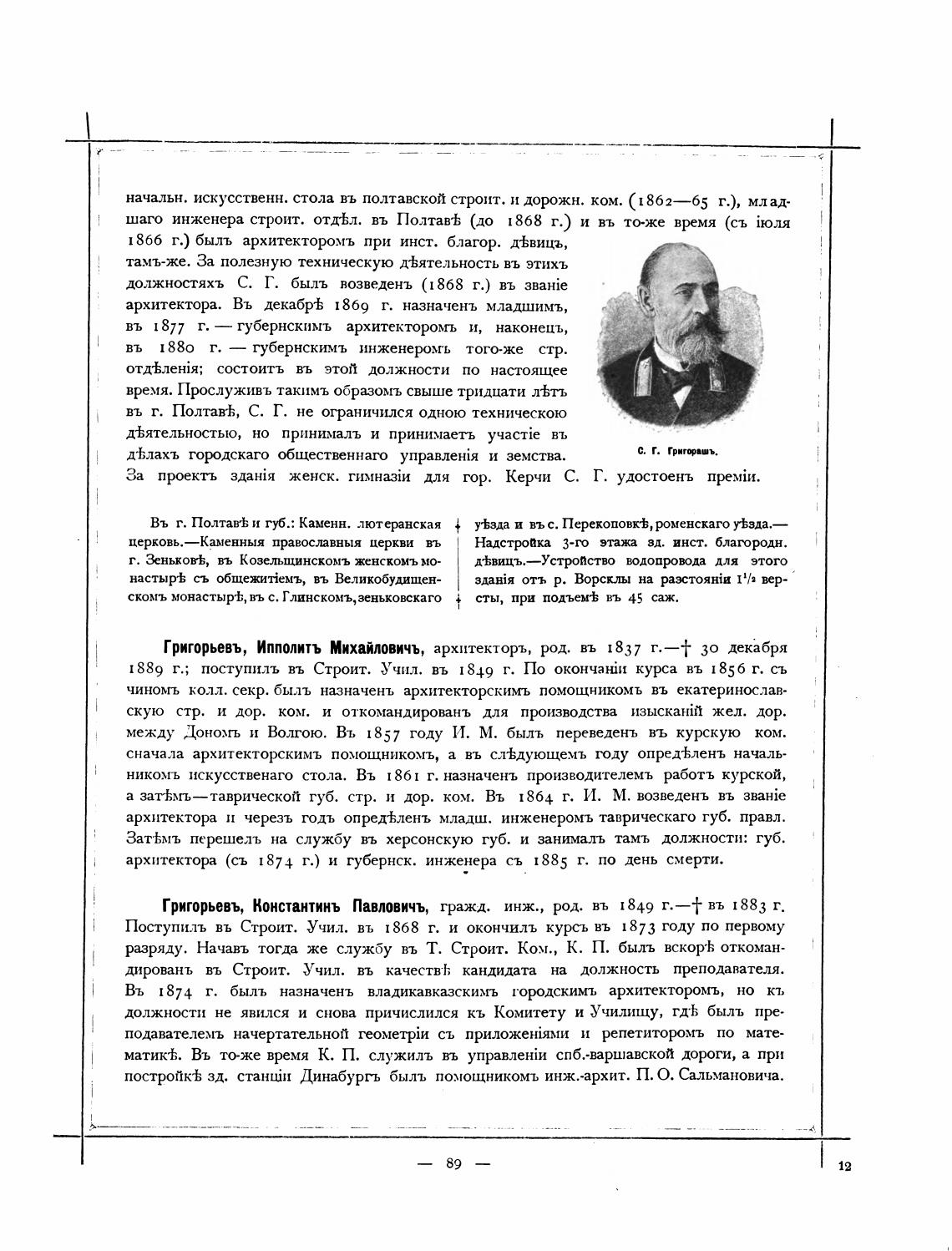 1889 г.; поступилъ въ Строит. Учил. въ 1849 г. По курса въ 1856 г. съ