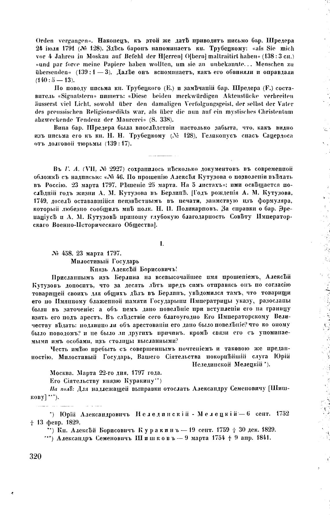 24 iro.m 1791 (Л; 128). Здђсь баронъ напоминаетъ кн. Трубецкому: «als Sie mic,h