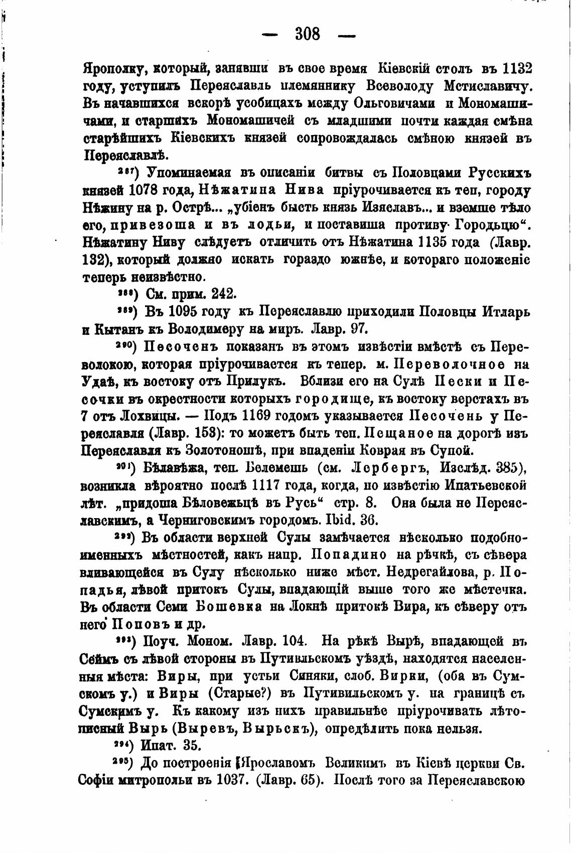 7 отъ Лохвицы. — Подъ 1169 годоиъ указывается Песочень у Пе-