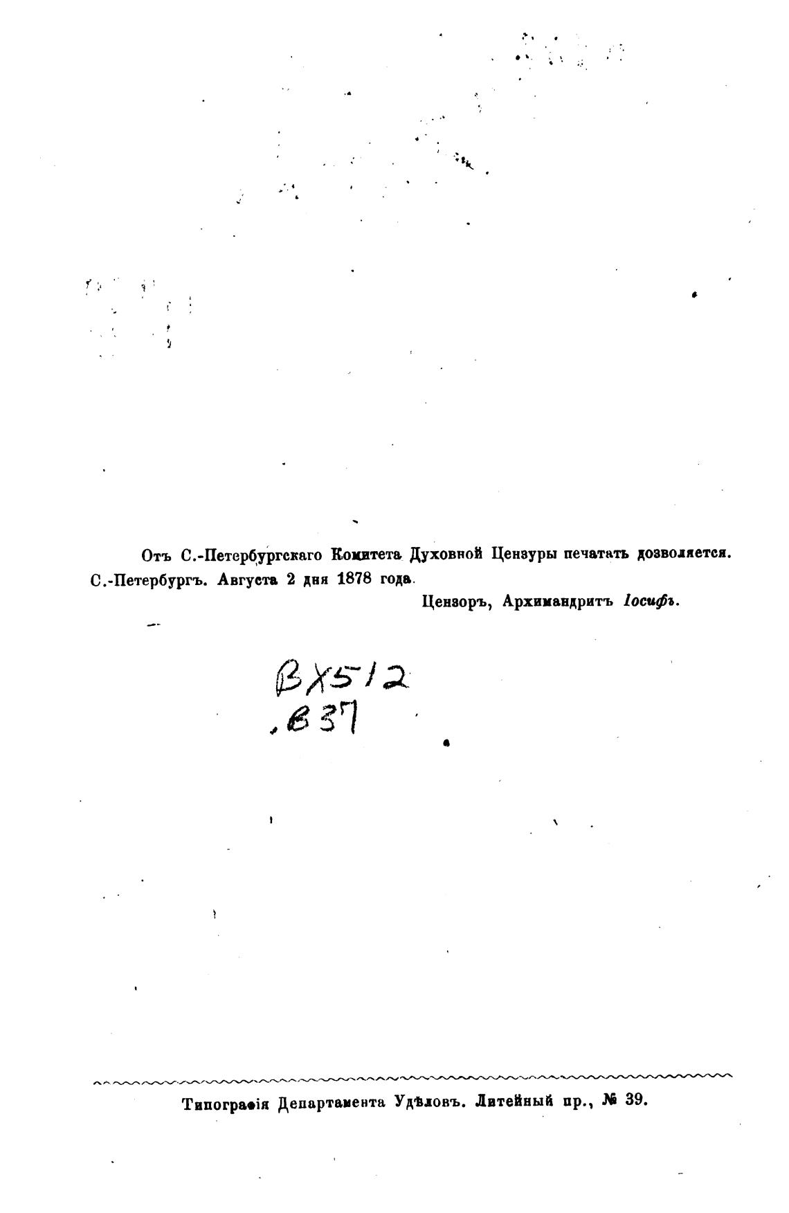 Отъ С.-Петербургежаго Коцитетв Духовной Цензуры печатать дозволяется.
