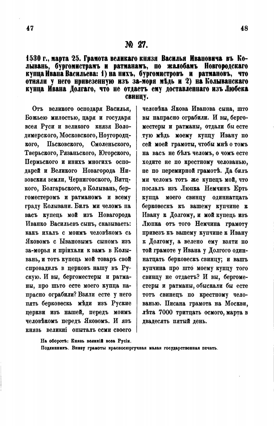 1530 г., парта 25. Грамота великаго князя Василья Ивановича въ Ко-