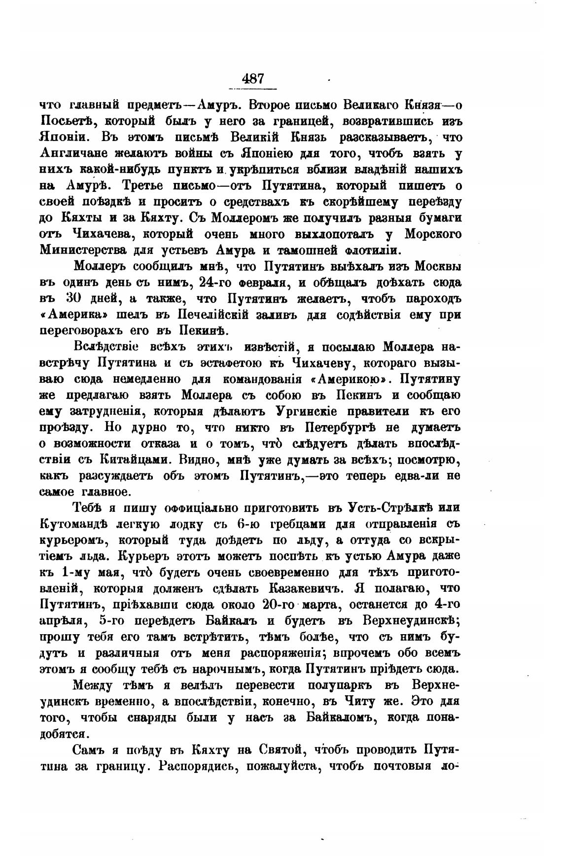 этомъ я сообщу теб'В съ нарочнымъ, когда Путятинъ прПдеть сюда.