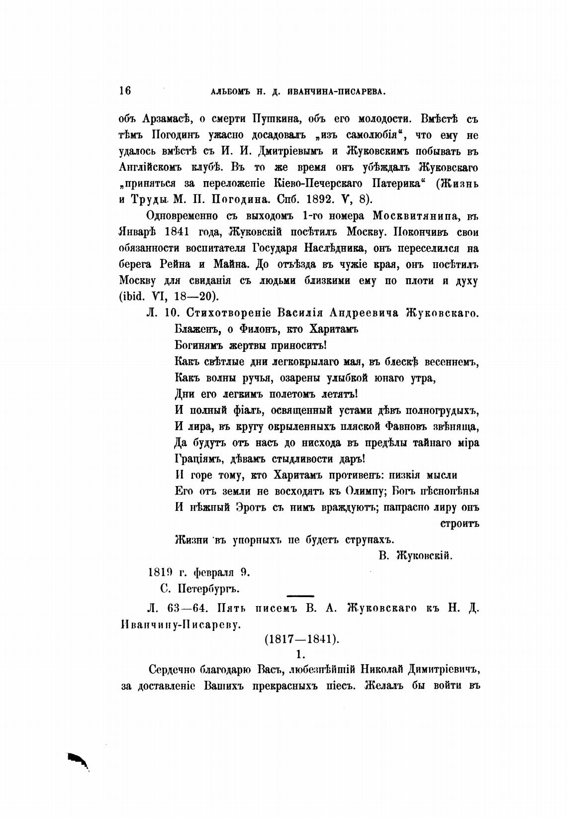 Л. 63—64. Пять писемъ В. А. Ж.уковскаго кь Н. Д.