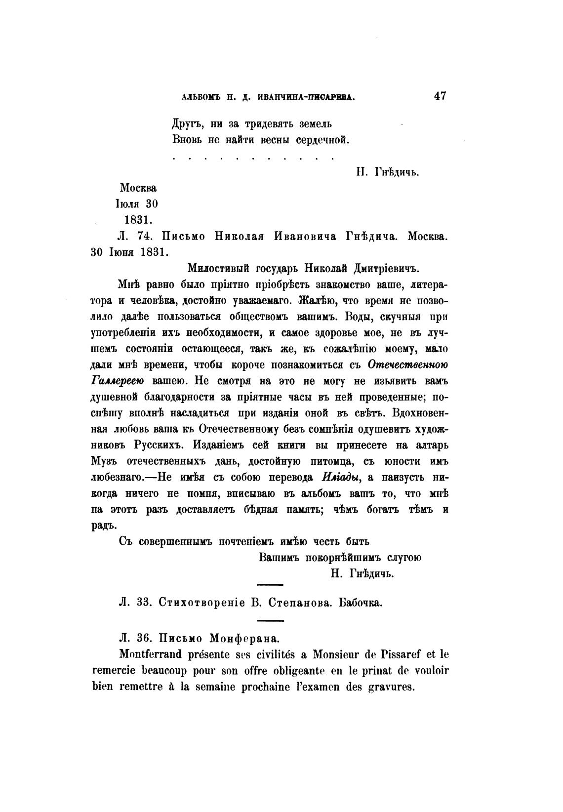 Л. 74. Письмо Николая Ивановича Гнгьдича. Моски.