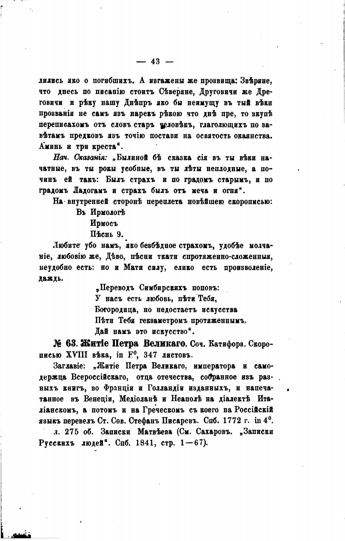 63. Жит\е Петра Великаго. соч. Катифора. своро-
