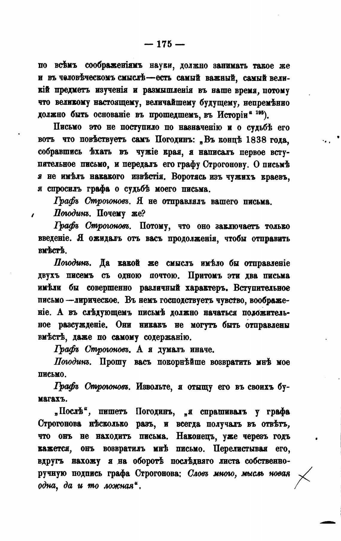 Пос.л%", пишеть Погодинъ, „а спрашивыъ у графа