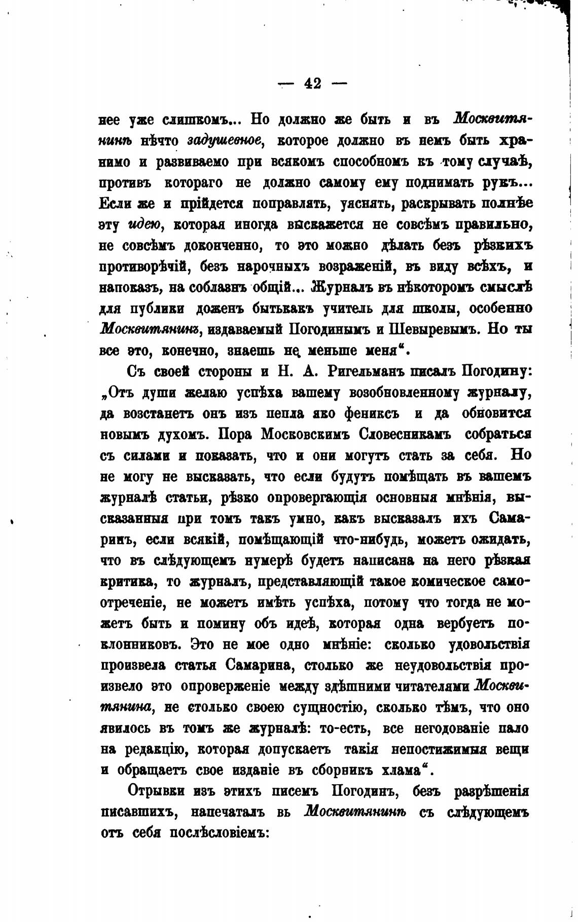 Съ своей стороны и Н. А. Ригельманъ Погодину: