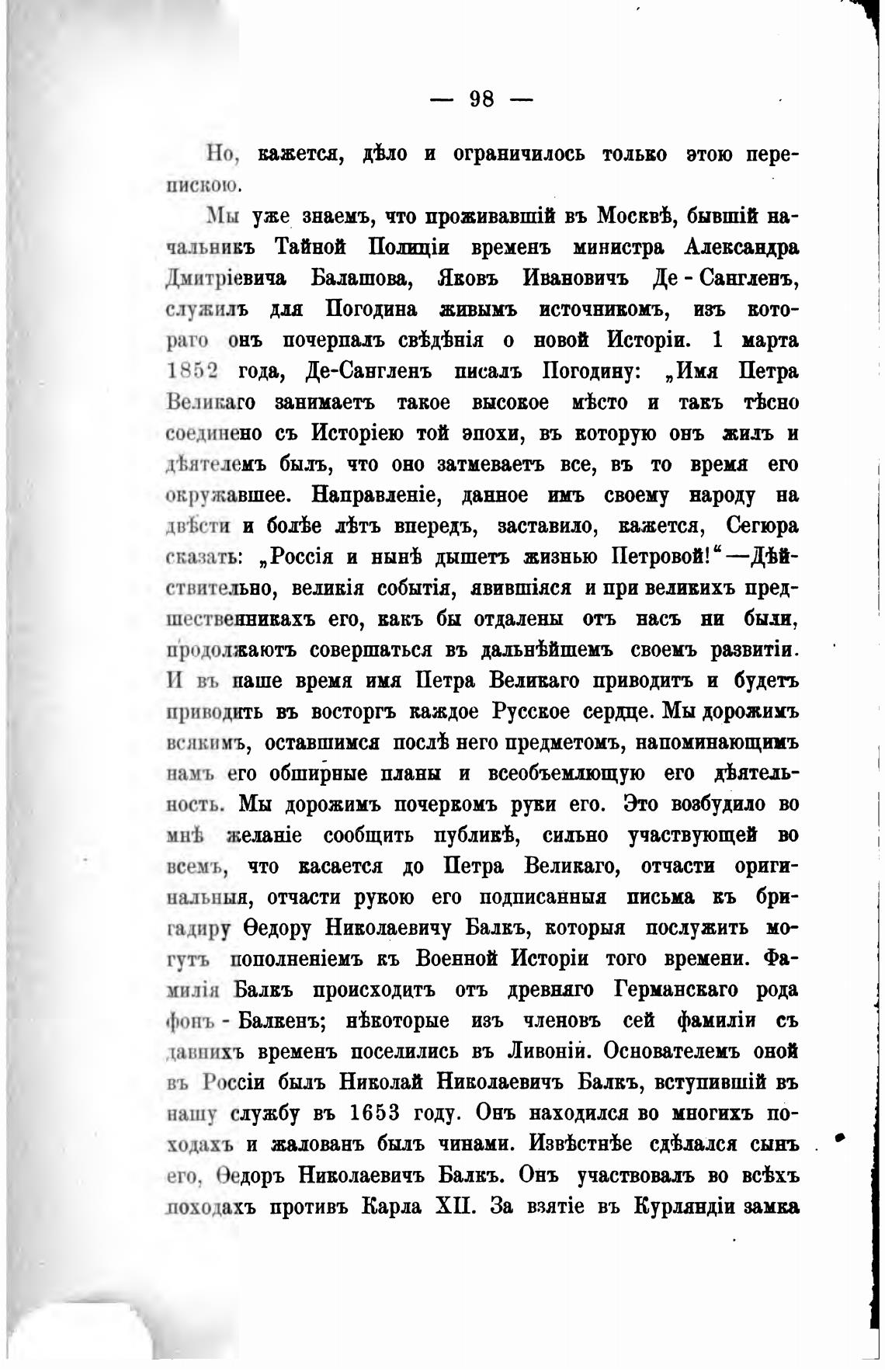 года, Де-Сангленъ писалъ Погодину: „Има Петра