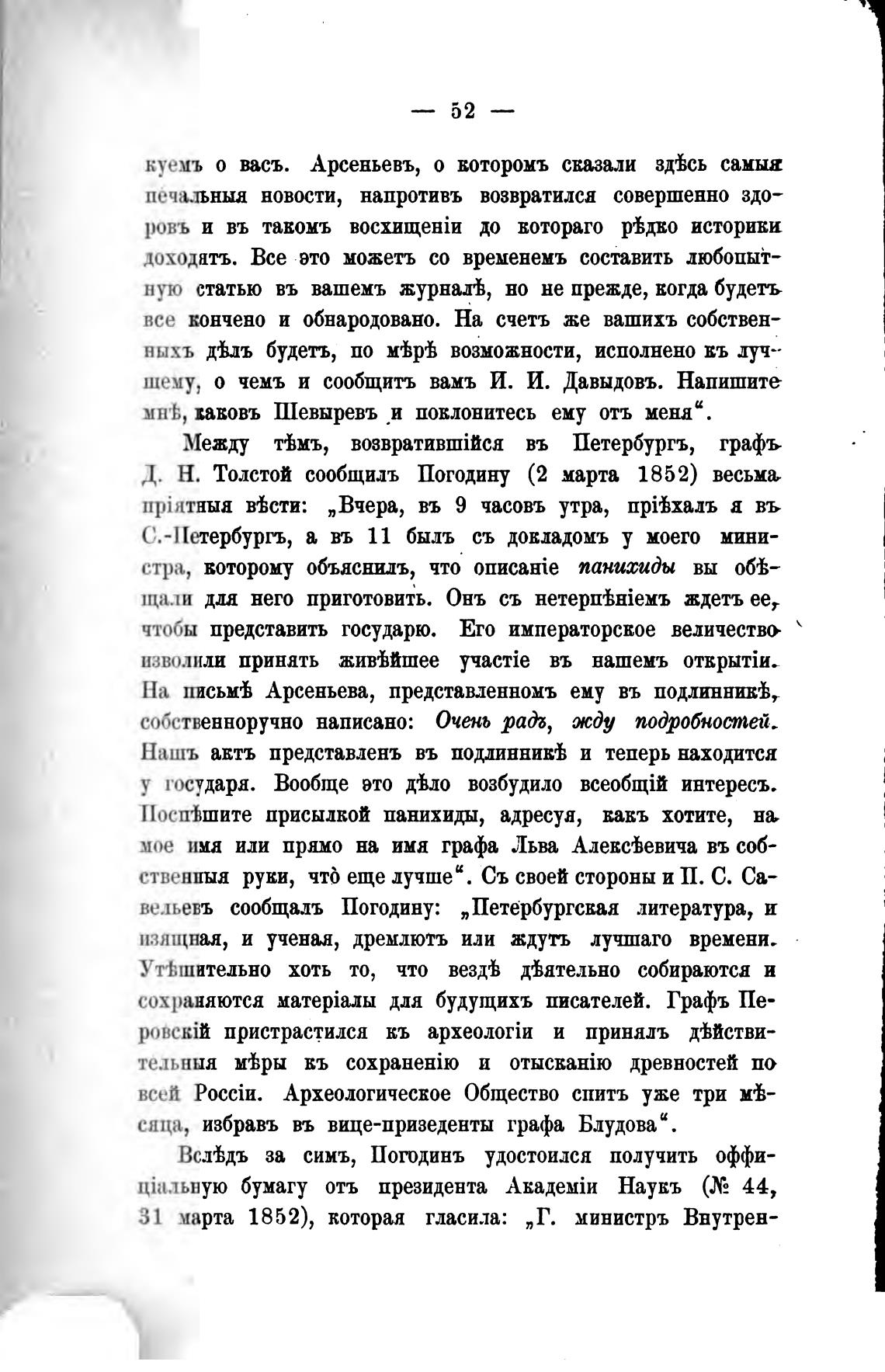 Д. Н. Толстой сообщилъ Погодину (2 марта 1852) весьмь