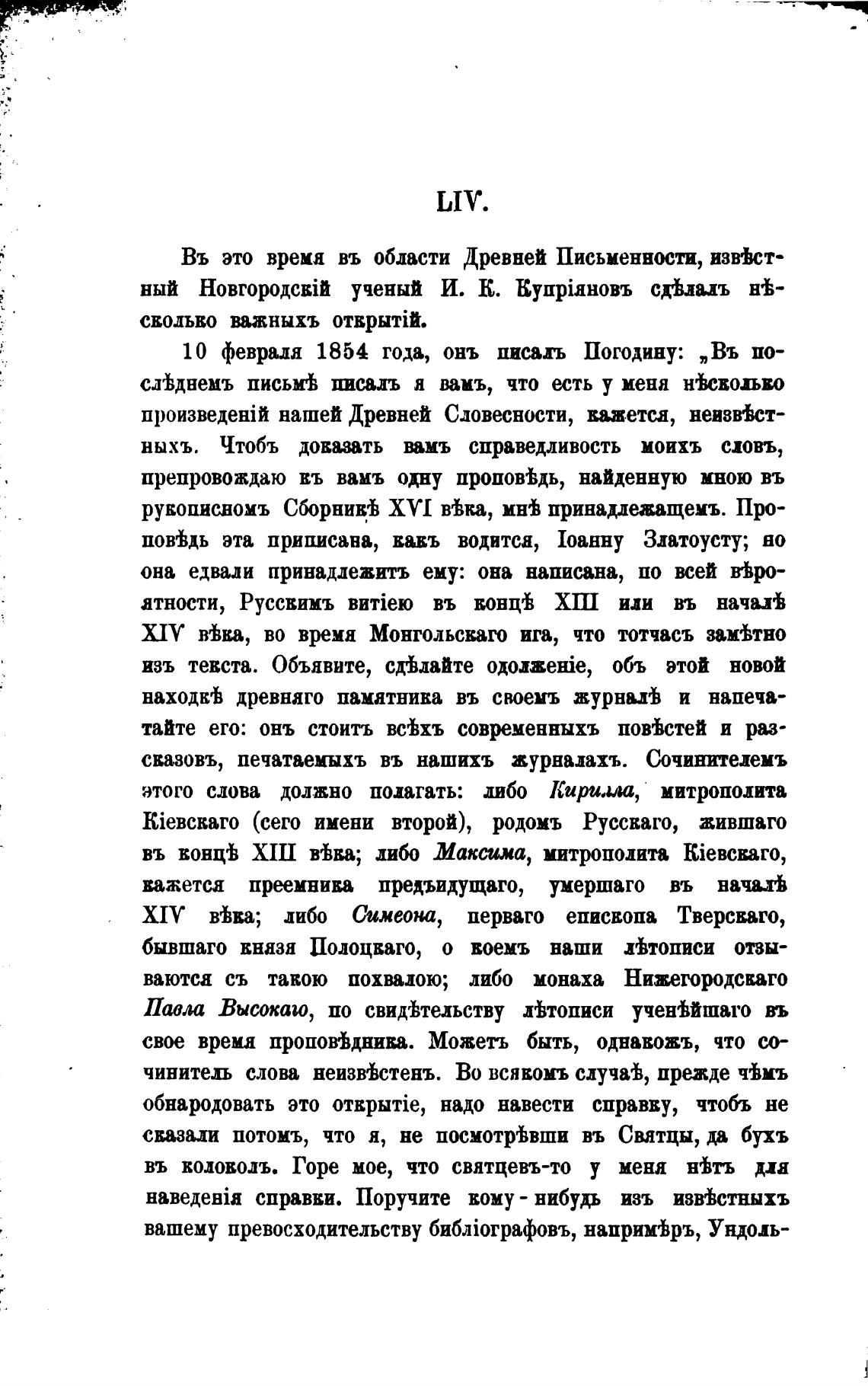 10 февраля 1854 года, онъ писать Погодину: „Въ по-