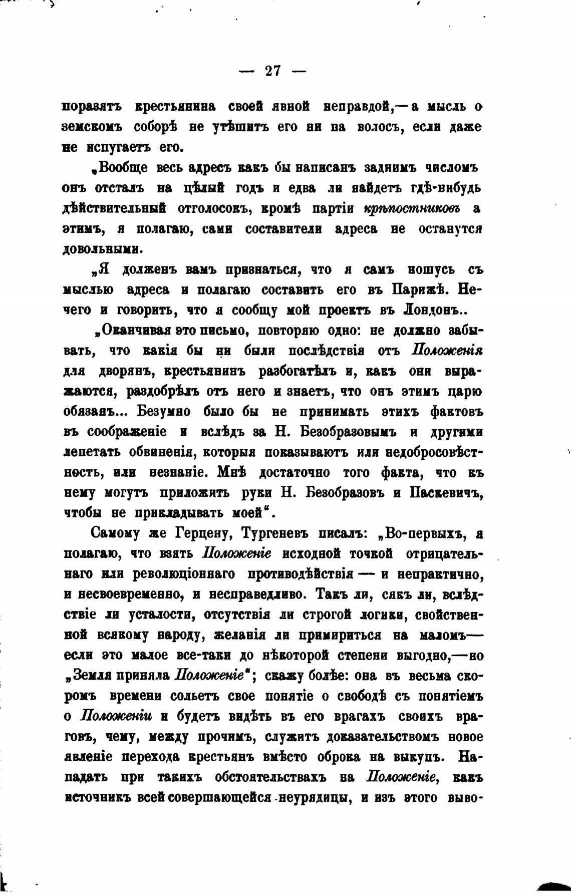 Самому же Герцену, Тургеневъ писалъ: „Во-первыхъ, а