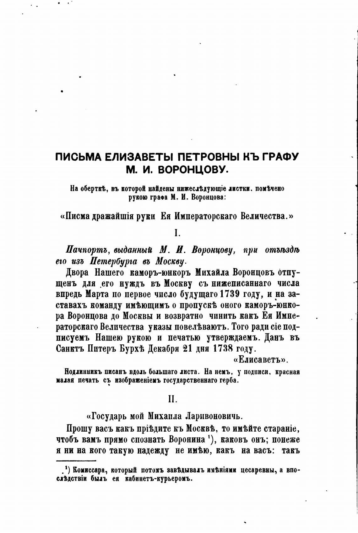 ПИСЬМА ЕЛИЗАВЕТЫ ПЕТРОВНЫ КЬ ГРАФУ