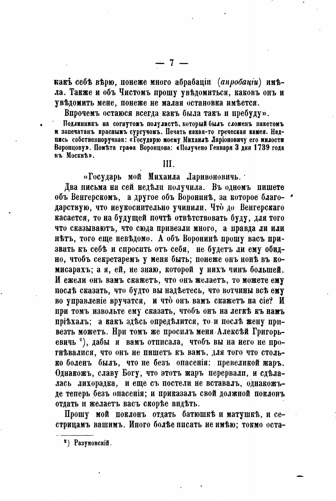 Воронцову». Поима графа Воронцова: «Получено Генваря З дня 1739 года