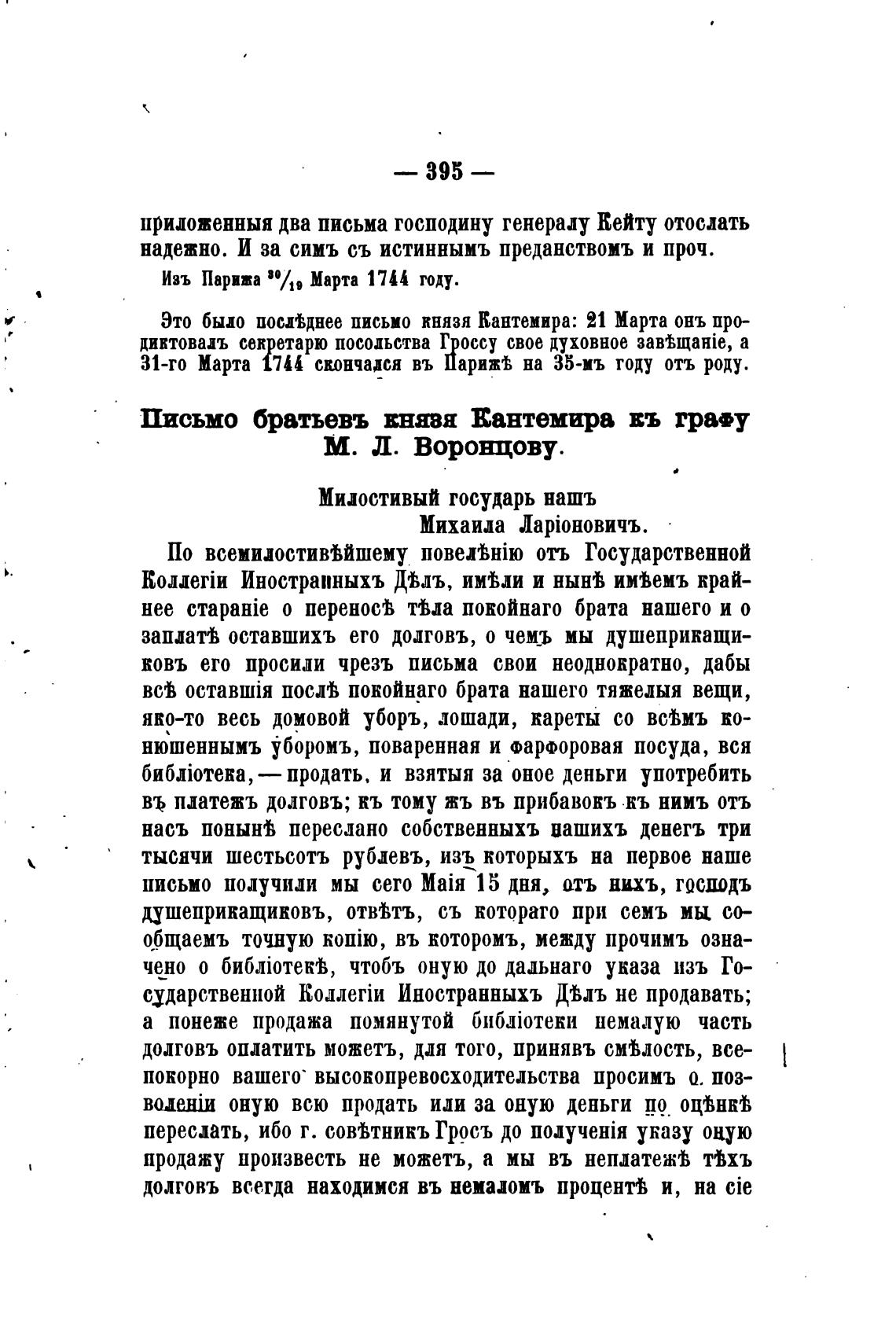 Это было послднее письмо князя Кантемира: 21 Марта онъ про-