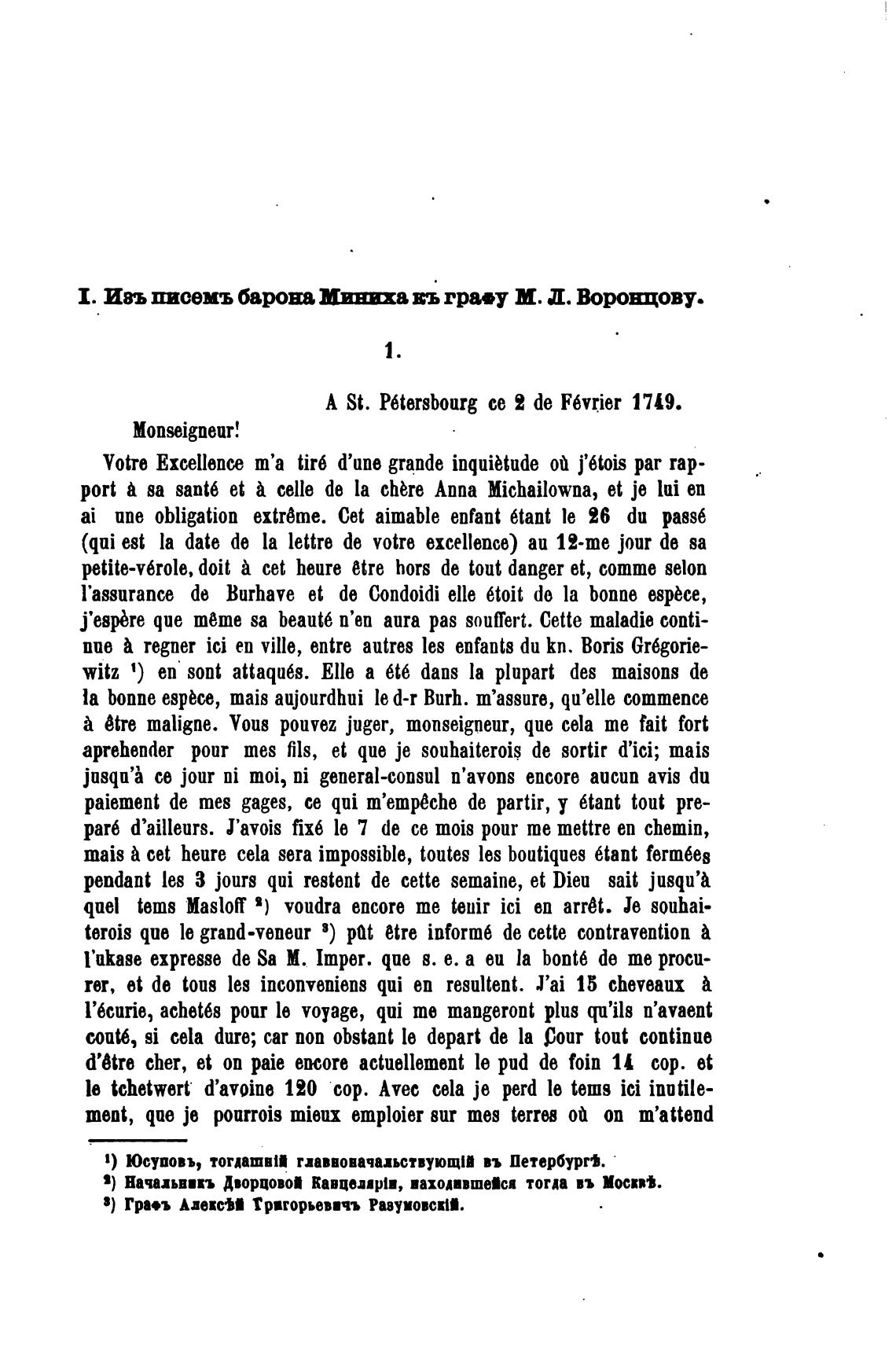 1. Ивъ писемъ бароо въ гра•у М. д. Вороцову.